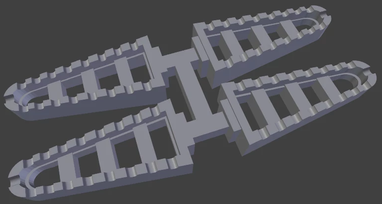Customised foot pegs for model motorcycles. These are based upon pegs I've seen on some bikes, with teeth for extra grip, and cut out sections to save weight. Four pegs, so that rider and passenger can have matching rests.