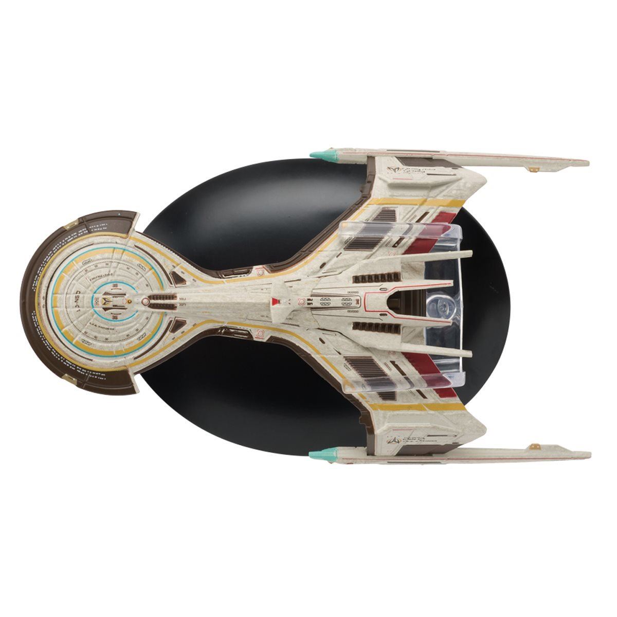 The A.F.S. Khitomer was the first ship constructed by the Alliance and combines technology from all three groups. It was designed by STO's Hector Ortiz. The Eaglemoss model is 5.3" (13.5 cm) long.