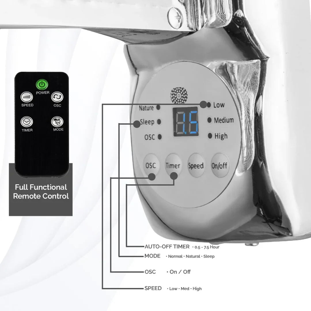 Full Control Panel and Remote Control: However you prefer to control your cooling. All of the functions of the 16" wall fan can be used from anywhere within your home thanks to the full-feature remote control. So you can customise your cooling in comfort.