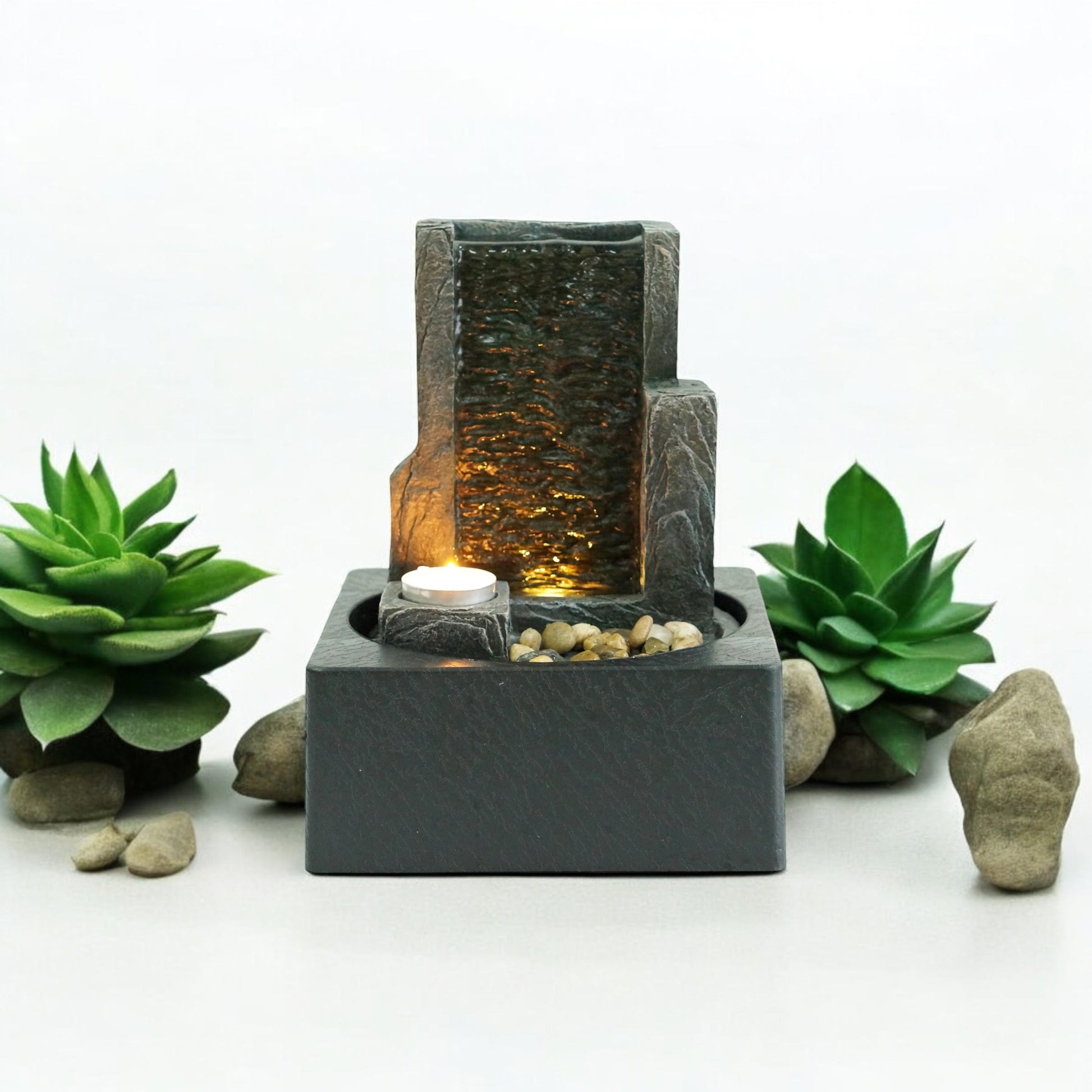 Relax and enjoy the sounds of nature with the fountain ! This relaxing tabletop fountain lets you listen to the sounds of a waterfall crashing down onto the tiers below as the sound and sight of trickling water is naturally soothing and water fountains help induce a feeling of calm and relaxation, Hand Finished 240 v