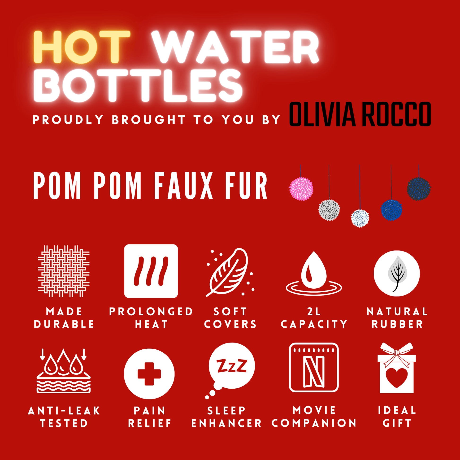 2L Soft Plush Hot Water Bottle with Faux Fur Pom Pom Cover for Warmth Durable Natural Rubber UK Safe Tested Cozy Winter Comfort Ideal Gift for Adults Kids by OLIVIA ROCCO