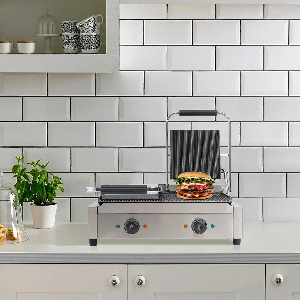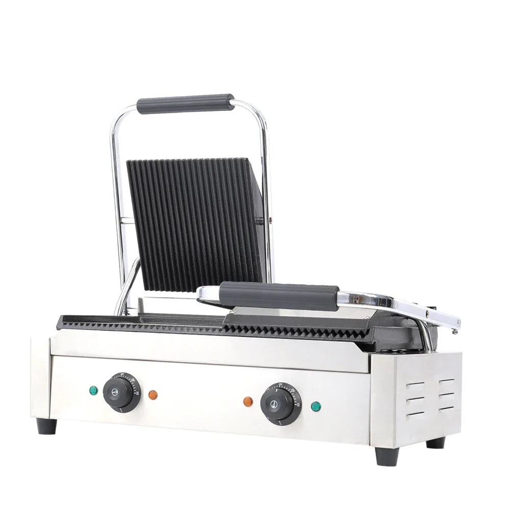 3.6KW Double Commercial Sandwich Press Grill with Knob Temperature Control for Cooking Sandwiches, Sausages, Eggs and Pancakes
