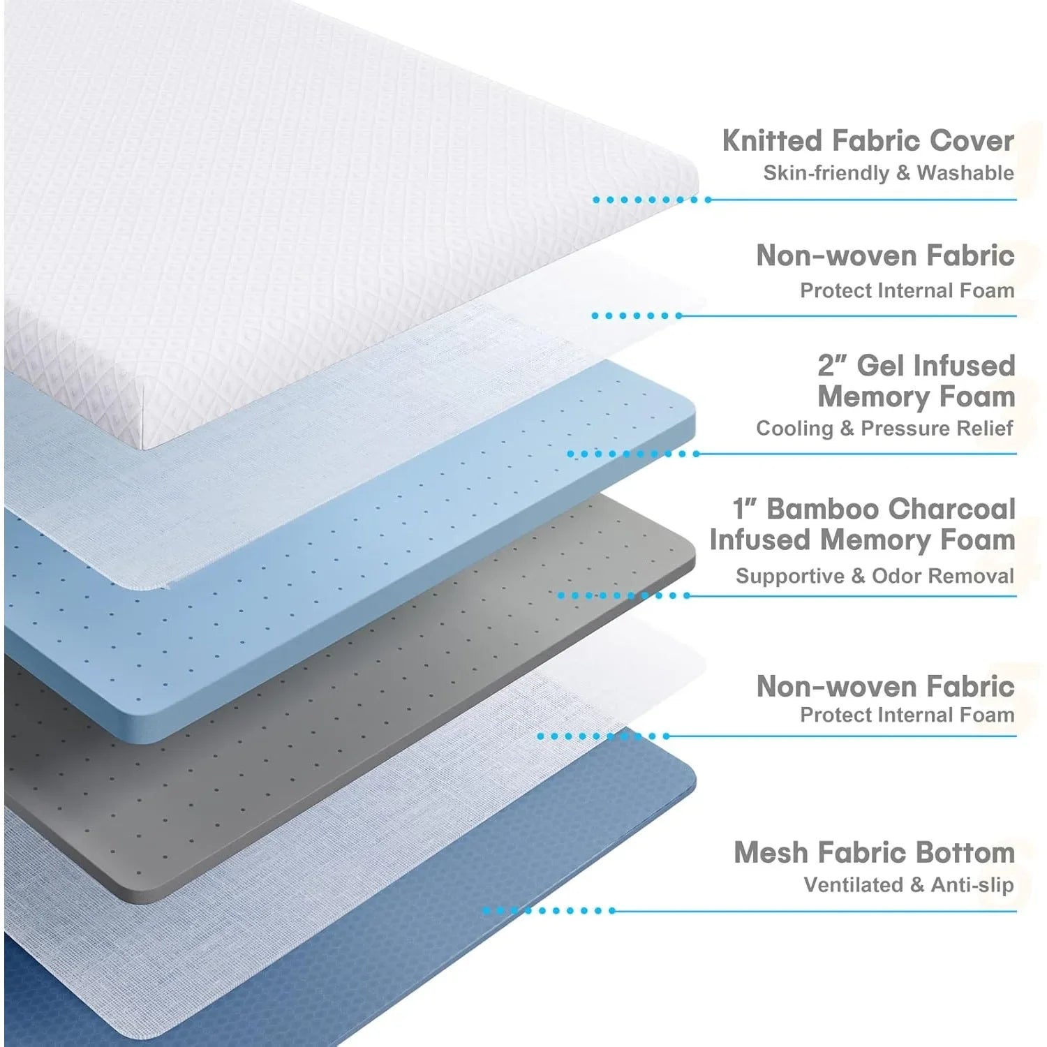3 Inch Memory Foam Mattress Topper, Gel and Bamboo Charcoal Infused for Cooling Sleep and Pressure Relieving with Washable Cover