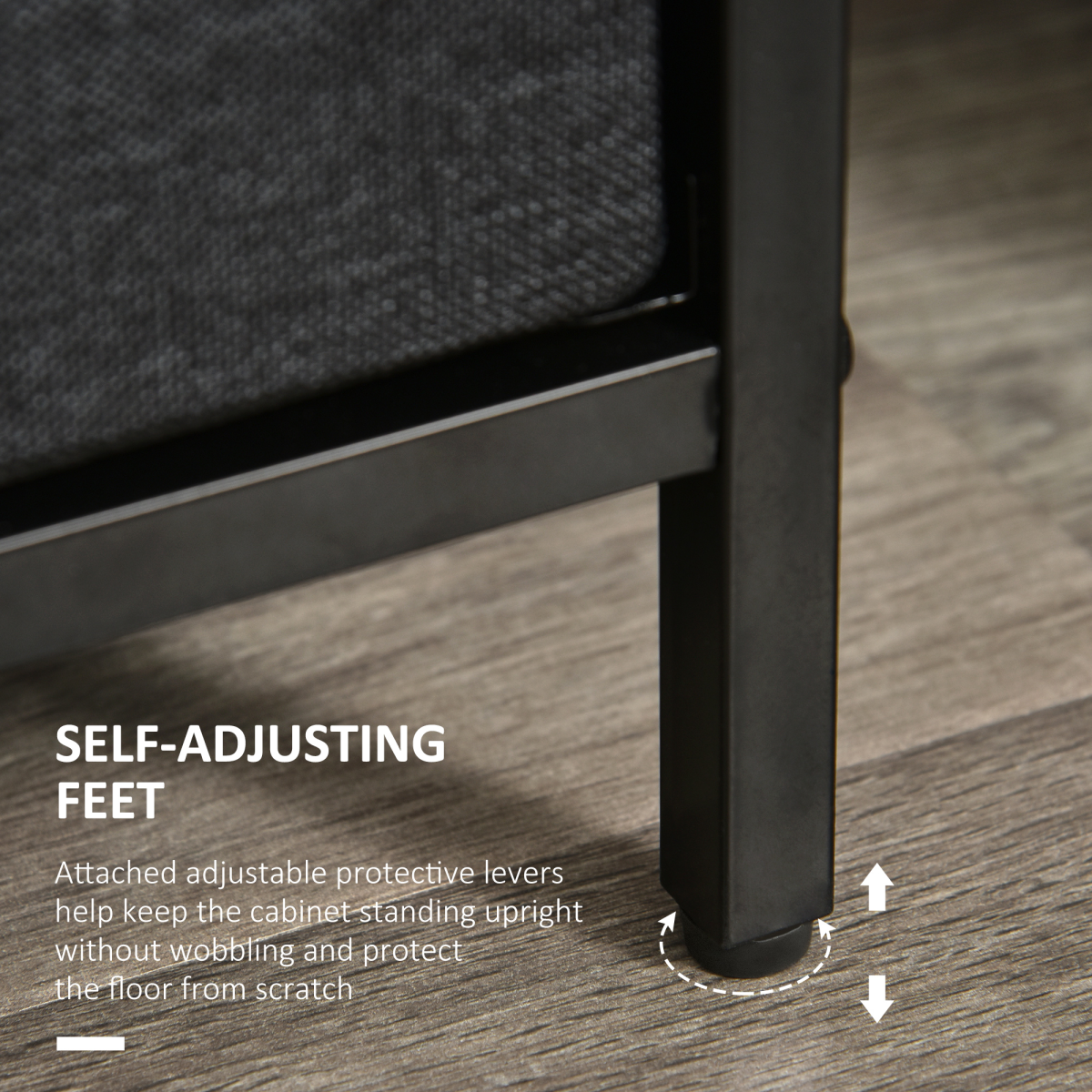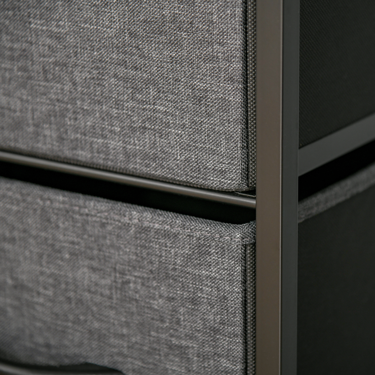 FOUR DRAWERS: Two large and two small, plenty of space for keeping your space tidy. Each foldable fabric drawer can be removed.TOP SHELVES: Made from MDF in a versatile wood effect, gives easy open display space. Smooth and easy to clean.METAL FRAME: Solid formation to hold the shape perfectly and support the weight of drawers and shelves. Adjustable feet for balance.DIMENSIONS: 103H x 58W x 29Dcm. Shelf: 31H x 54.5W x 27Dcm. Small drawer inner: 18.5H x 27.2W x 26.2Dcm. Large drawer inner: 18.5H x 53.2W x 27.2Dcm.MAXIMUM LOAD 32KG. ASSEMBLY REQUIRED.