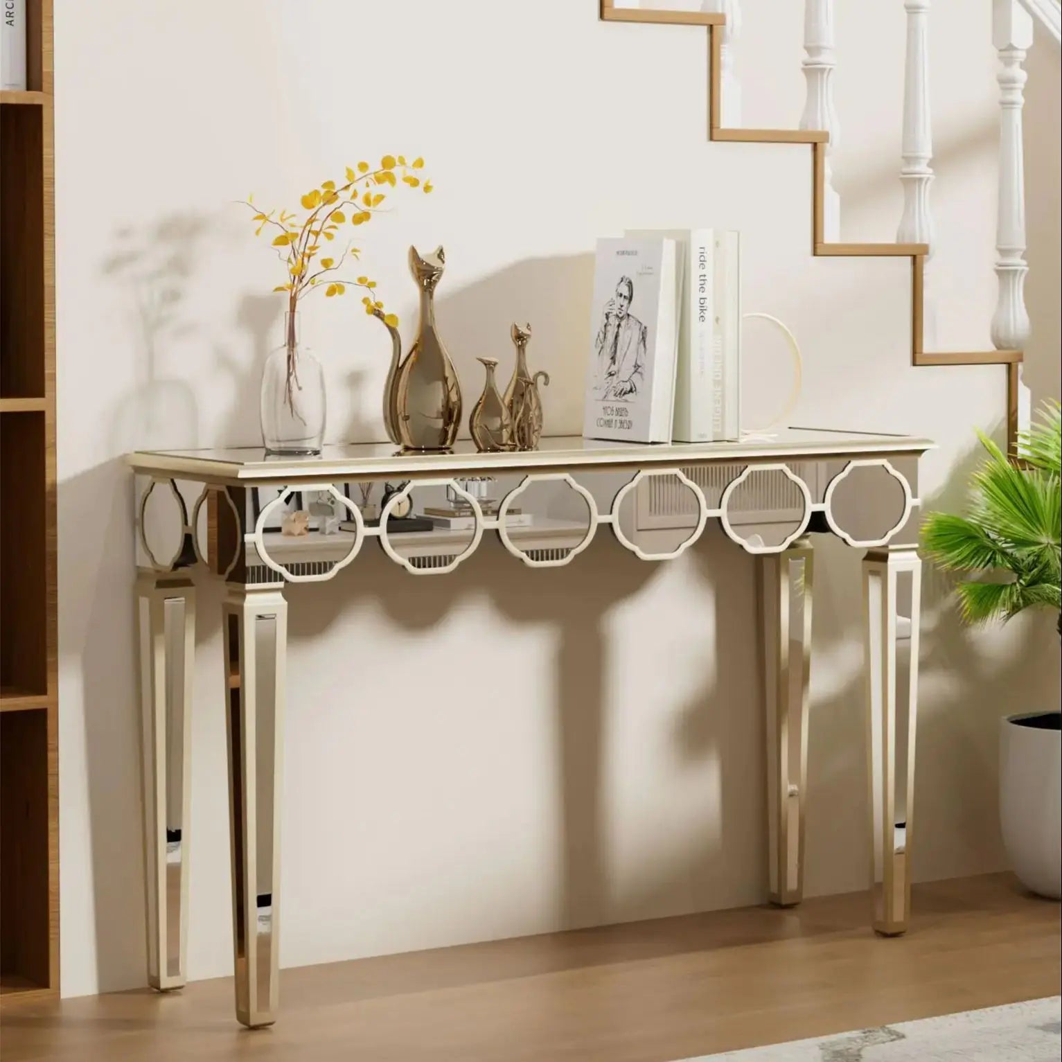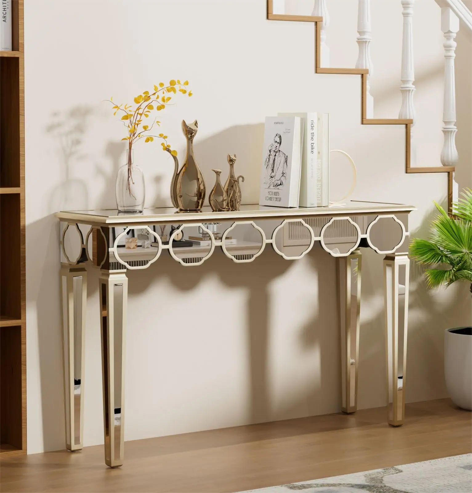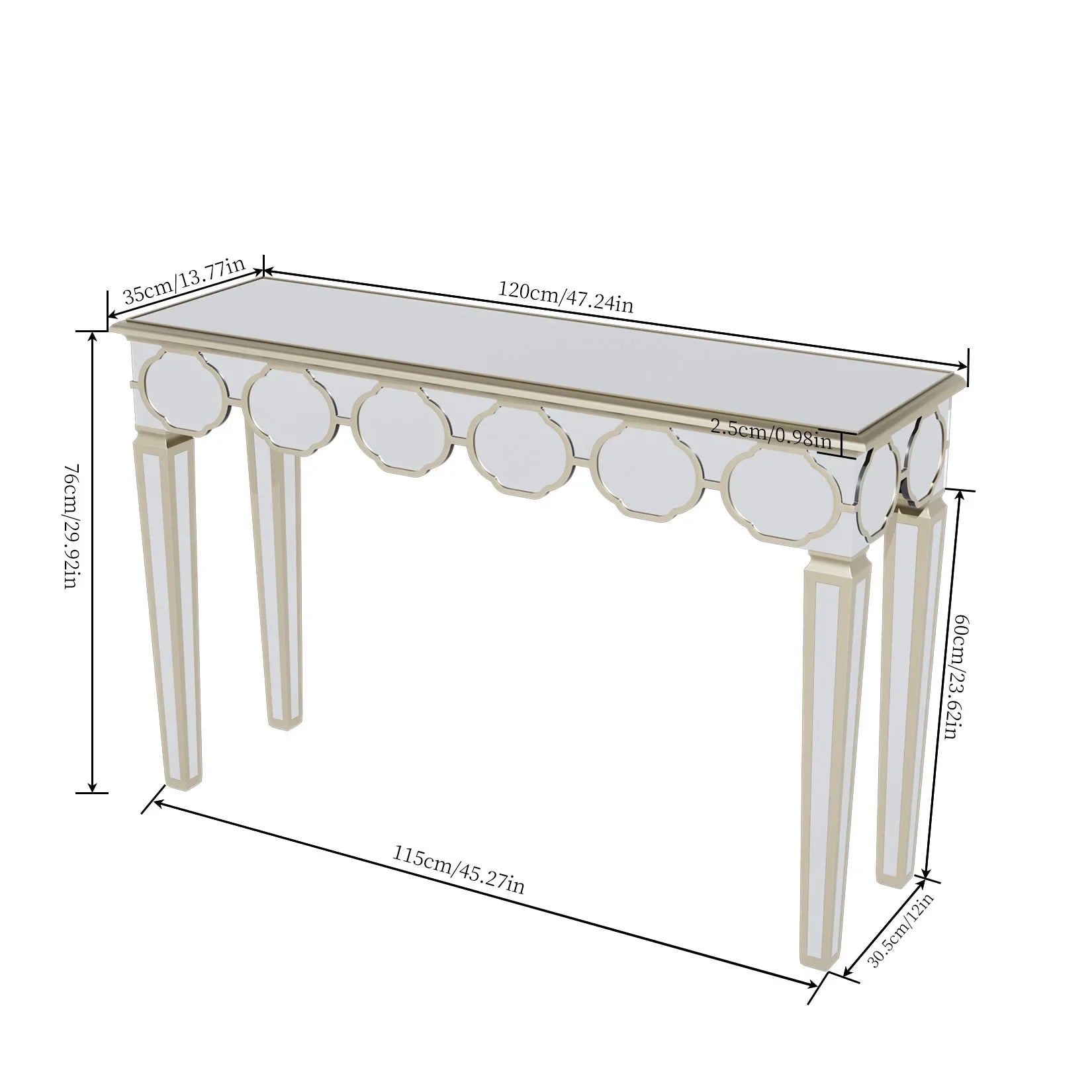 48'' Console Table Rectangular Silver Mirrored Entryway Table with Gold Rim Decor