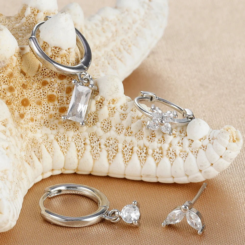 4PCS Flower Square Earrings Set for Women Girl Luxury Zircon Stainless Steel Cartilage Piercing Hoop Earring Statement Jewelry