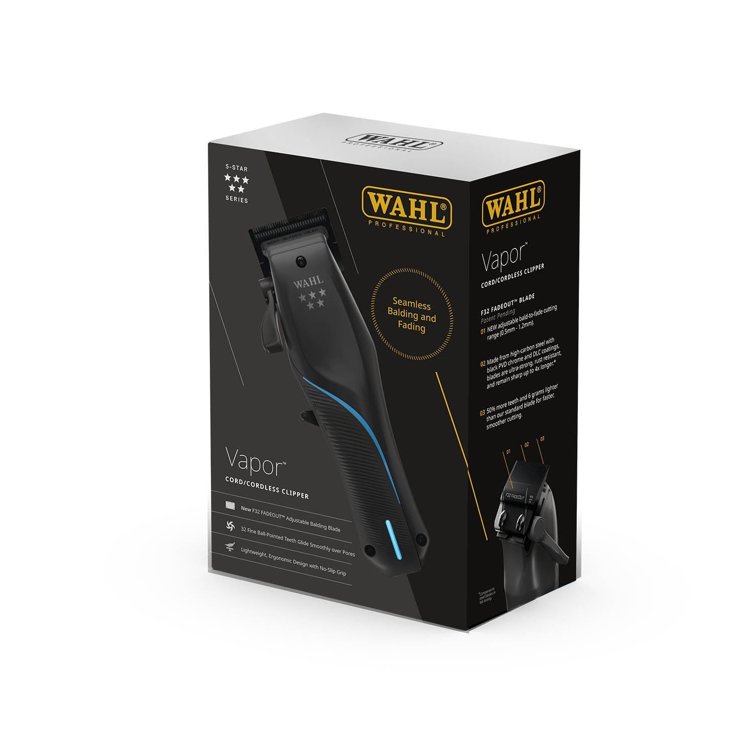 Introducing the latest stand-out leap in barber technology, the Wahl 5 Star Vapor™ Clipper. Our design process from the start of development has been to give a focus on seamless blending and fading. To that end we decided to build an innovative adjustable balding blade that allows you to go from bald to fade without needing to swap blades or guard. The Vapor™ combines a high-powered brushless motor with the new F32 FADEOUT™ blade for rapid precision.