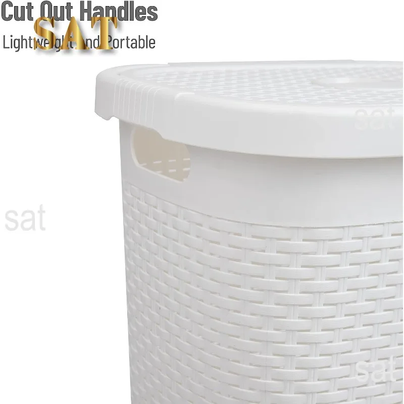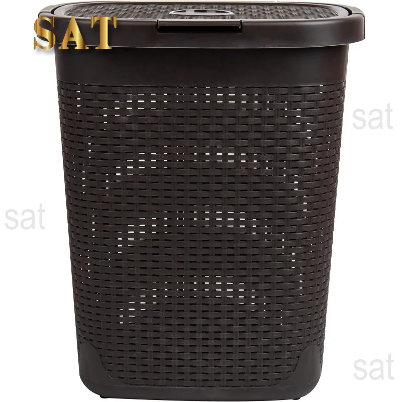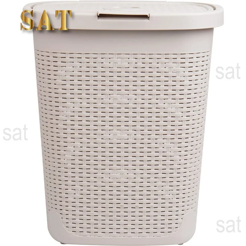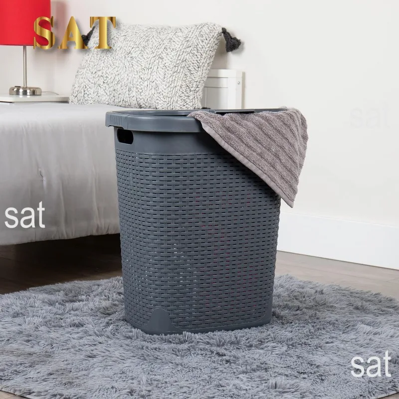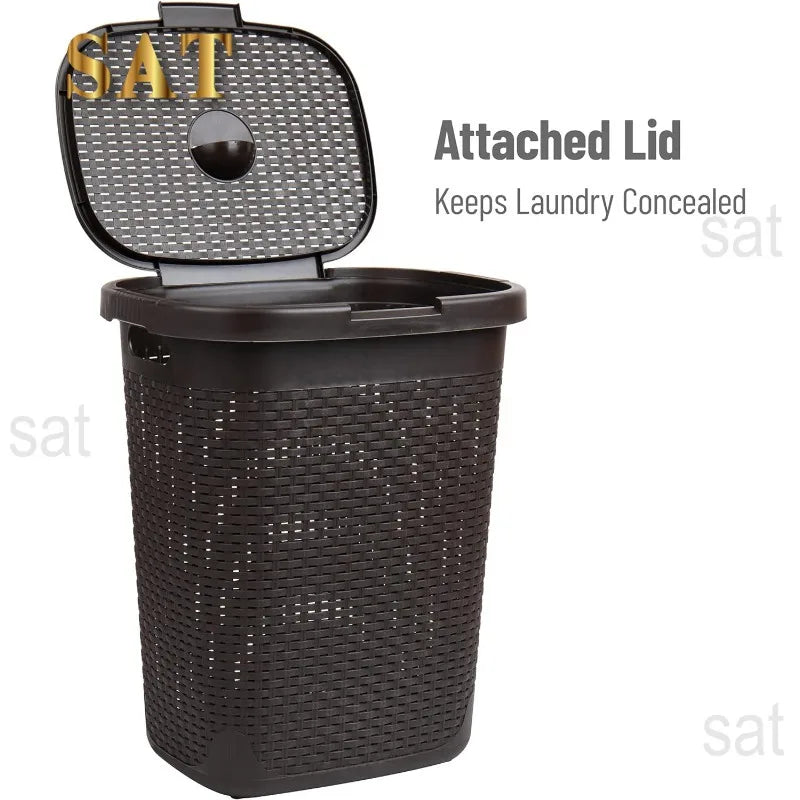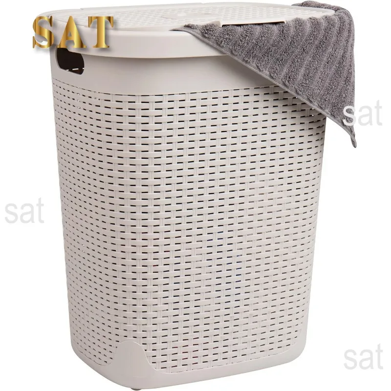50L Slim Laundry Hamper, Clothes Basket, Lid, Wicker Design, Plastic, 17.65"L x 13.75"W x 21"H
