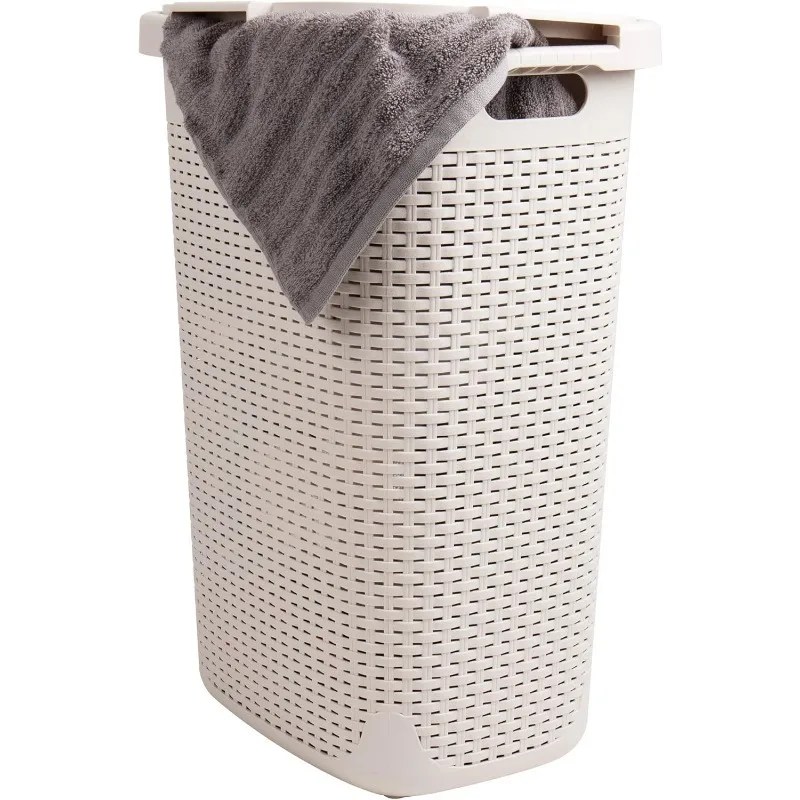 60L Slim Laundry Hamper, Clothes Basket, Lid, Wicker Design, Plastic