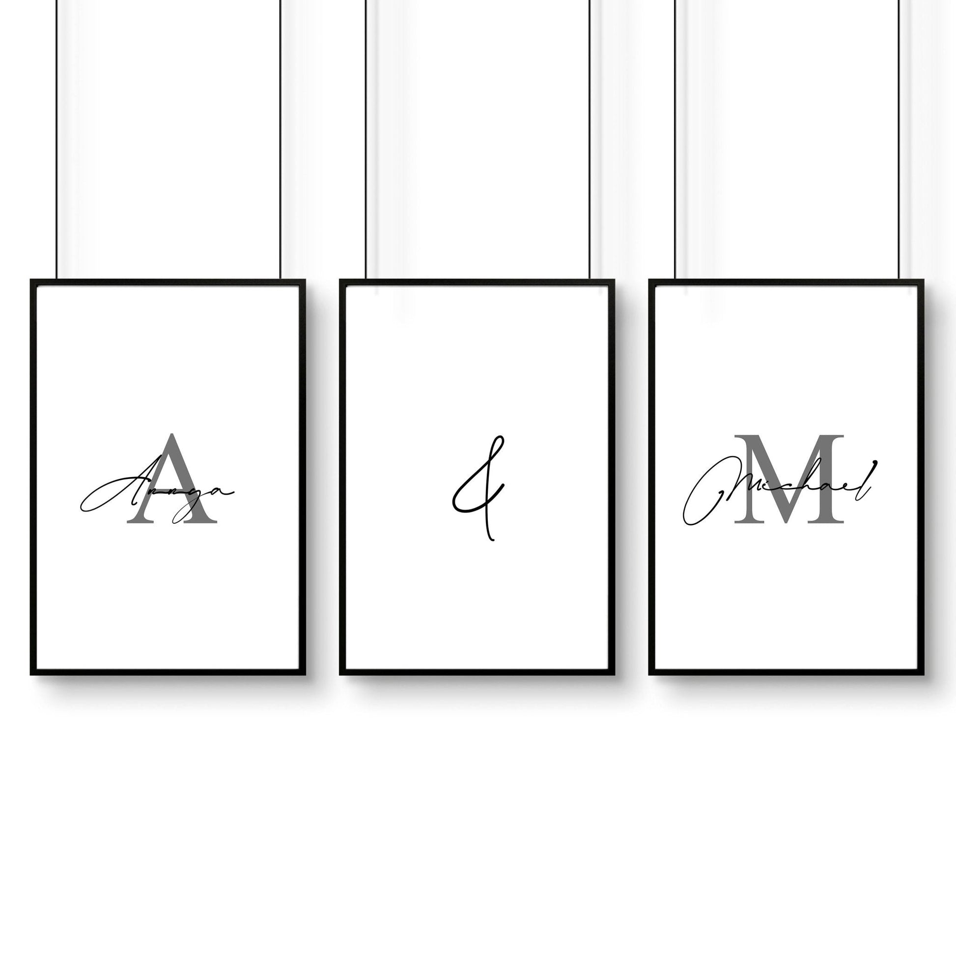 Each print in this set beautifully incorporates the couple's names, adding a sentimental touch to your bedroom decor. The black-and-white palette creates a timeless and classic aesthetic, making these prints a perfect addition to any interior style.