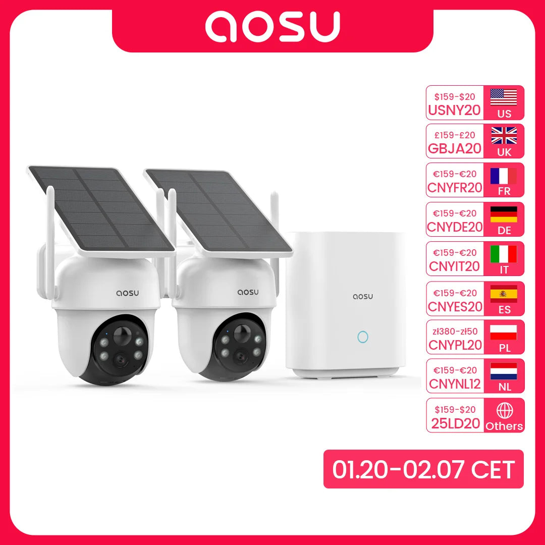 AOSU 2K 3MP Solar Battery Camera System 2 Cam Kit Wireless 360° PTZ Surveillance Wifi Camera Set Include Home Base Support Alex