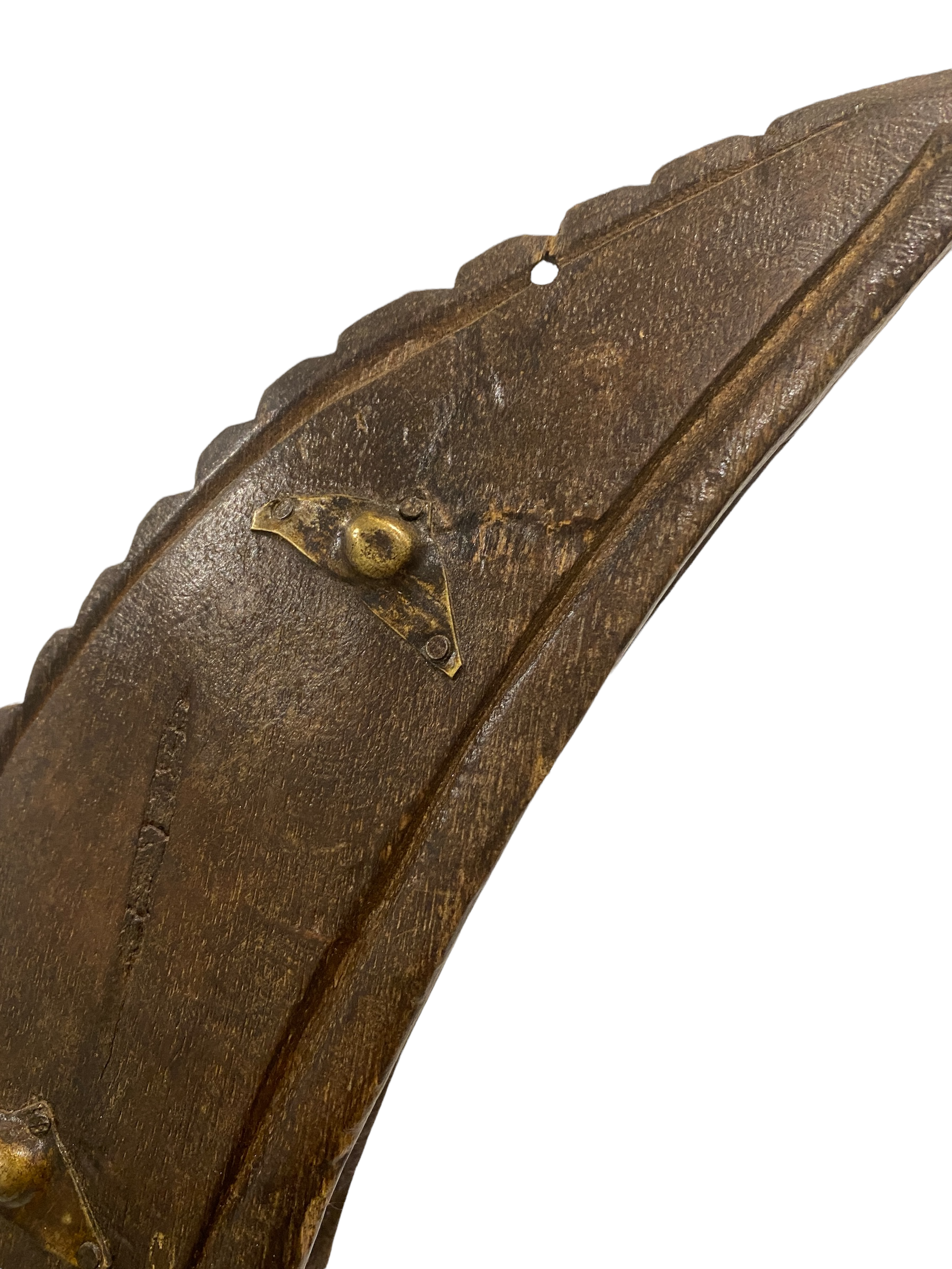 A beautiful hand crafted helmet mask embellished with metal and fabric detail. Each mask represents male or female. Originates from Mali. The masks are used in ceremonies and worn on the head.