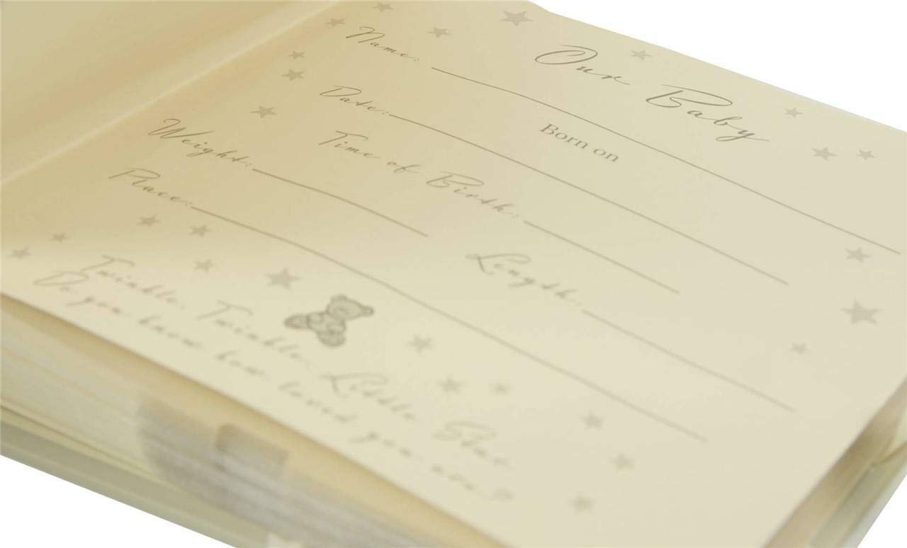 Photo Album Gift For Parents - New Baby Boy, Girl Arrival Or Baby Shower 7x8" Beige, White Star Pattern With Silver Plated Diamante Pram & Ivory Ribbon. Comes Boxed. Reads 'Twinkle Twinkle Little Star Do You Know How Loved You Are?' With Page For Baby Birth Details 40 Pages With Plastic Film Sleeve Holders (4x6") - For Baby Daughter Or Son Pictures Keepsake Book For Milestone Memories - Christenings, First Tooth, Curl, Steps, 1st Birthday