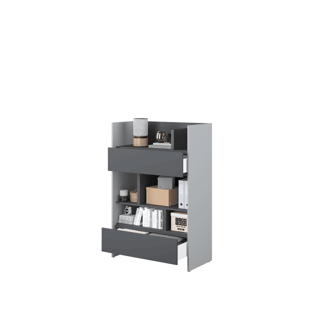 Features include multiple adjustable shelves and two smooth-glide drawers, offering organized storage for linens, dinnerware, or office supplies. With a net weight of 63kg, the cabinet provides stable support and a substantial feel while pairing seamlessly with other matching furniture in the Bed Concept range.