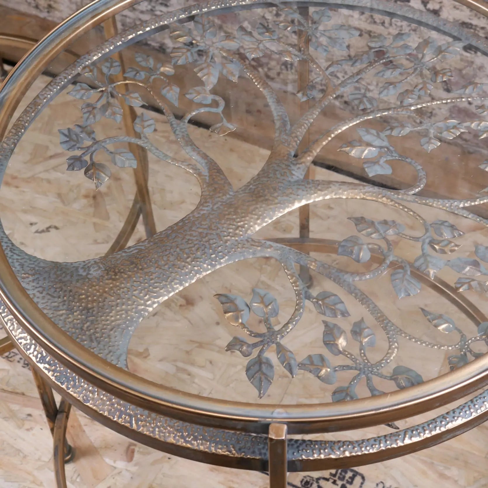 Discover the elegance of nature-inspired design with our Belagavi Set of 2 Gold Round Side Tables. These tables blend the organic beauty of tree motifs with the sleekness of modern materials, creating a stunning visual impact in any space. Crafted from sturdy metal and adorned with a sophisticated glass top, each table features an intricate tree design that adds a touch of elegance and complexity to its structure.