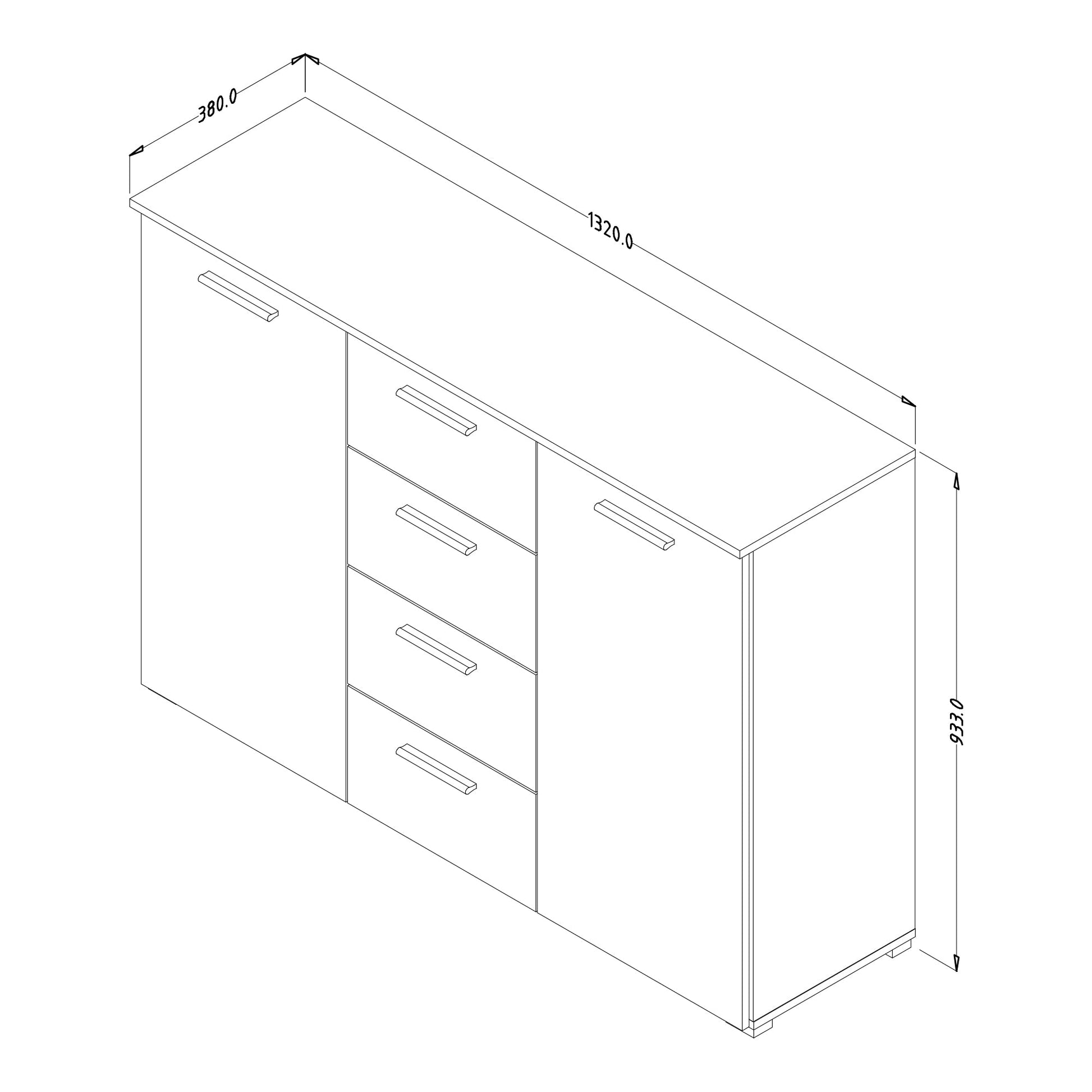 The Beta Sideboard Cabinet combines contemporary style with practical storage for living and dining spaces. Finished in a contrast of black gloss and Oak Monastery, it delivers a modern aesthetic while concealing clutter. The unit includes four drawers and two covert shelves, providing organized space for tableware, media accessories, linens, and other household items.