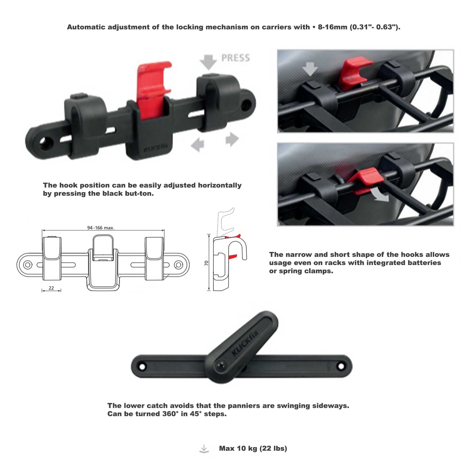 Quick Release KlickFix quick adjustable attachment system that works on racks with tube diameters of 8-16 mm (0.31"- 0.63"). The narrow and short shape of the hooks allows usage even on racks with integrated batteries or spring clamps.