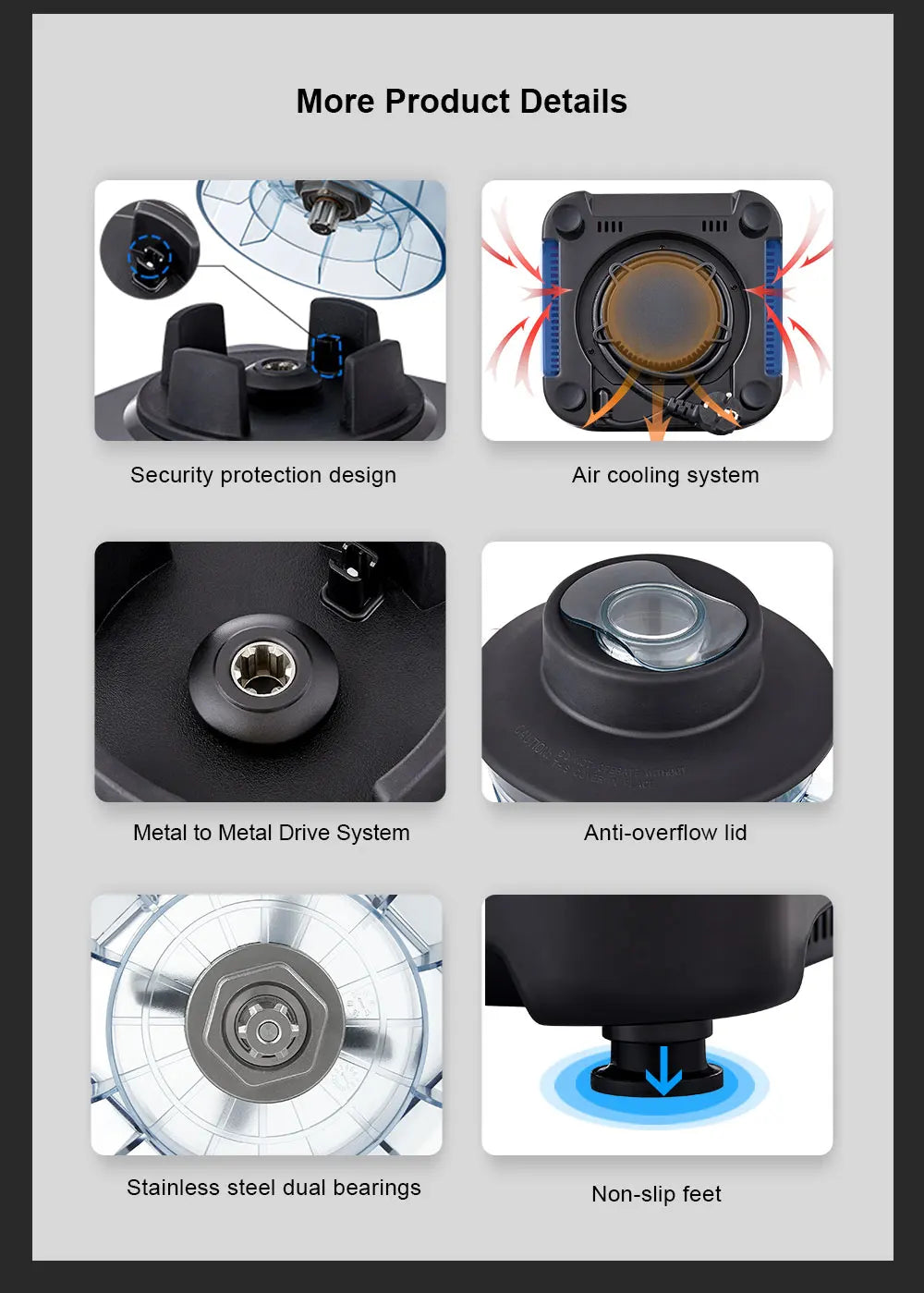 Large Capacity BPA Free Container: The 2L(1.7L max) food safety plastic jar is convenient, lightweight which is free from the potentially harmful Bisphenol A and is also extremely durable and hard-wearing.The jar is also conically shaped which helps food to be drawn down into the blades more effectively creating a smoother and finer result.
