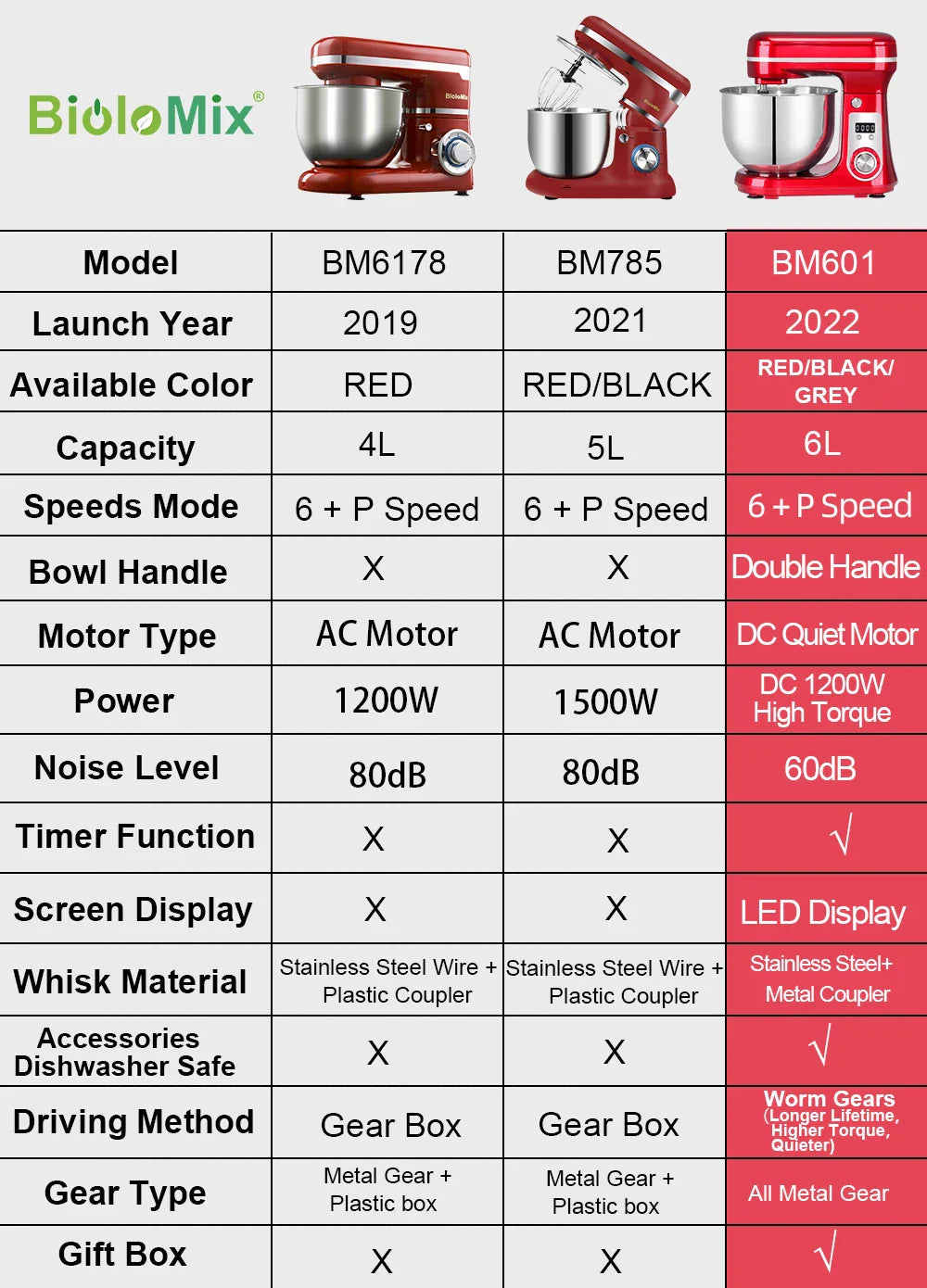 【1200W Powerful DC Motor & Accurate 6 + P Speed Control】The BioloMix 6L stand mixer uses a max 1200W high-end pure copper DC quiet motor with high operating efficiency, equipped with hall sensors and additional pulse settings. 6 optimized speeds with timer function easily knead doughs, thick batters, meringues and whipped cream.