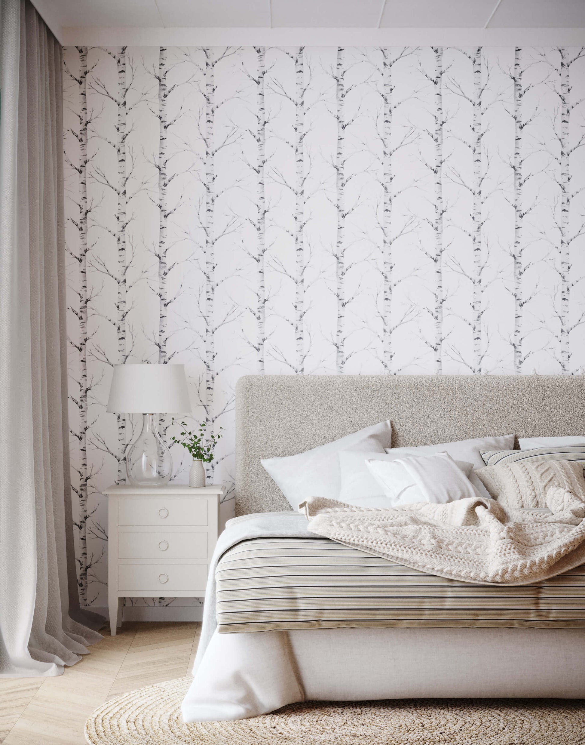 Bring an element of the outdoors into your space with our 'Birch' forest wallpaper. The striking repeat pattern consisting of silver birch trees lined up next to each other exudes calmness and tranquility. The prominent white/grey tones mean this wallpaper can be paired with brightly coloured furniture or surroundings, providing high levels of styling flexibility.