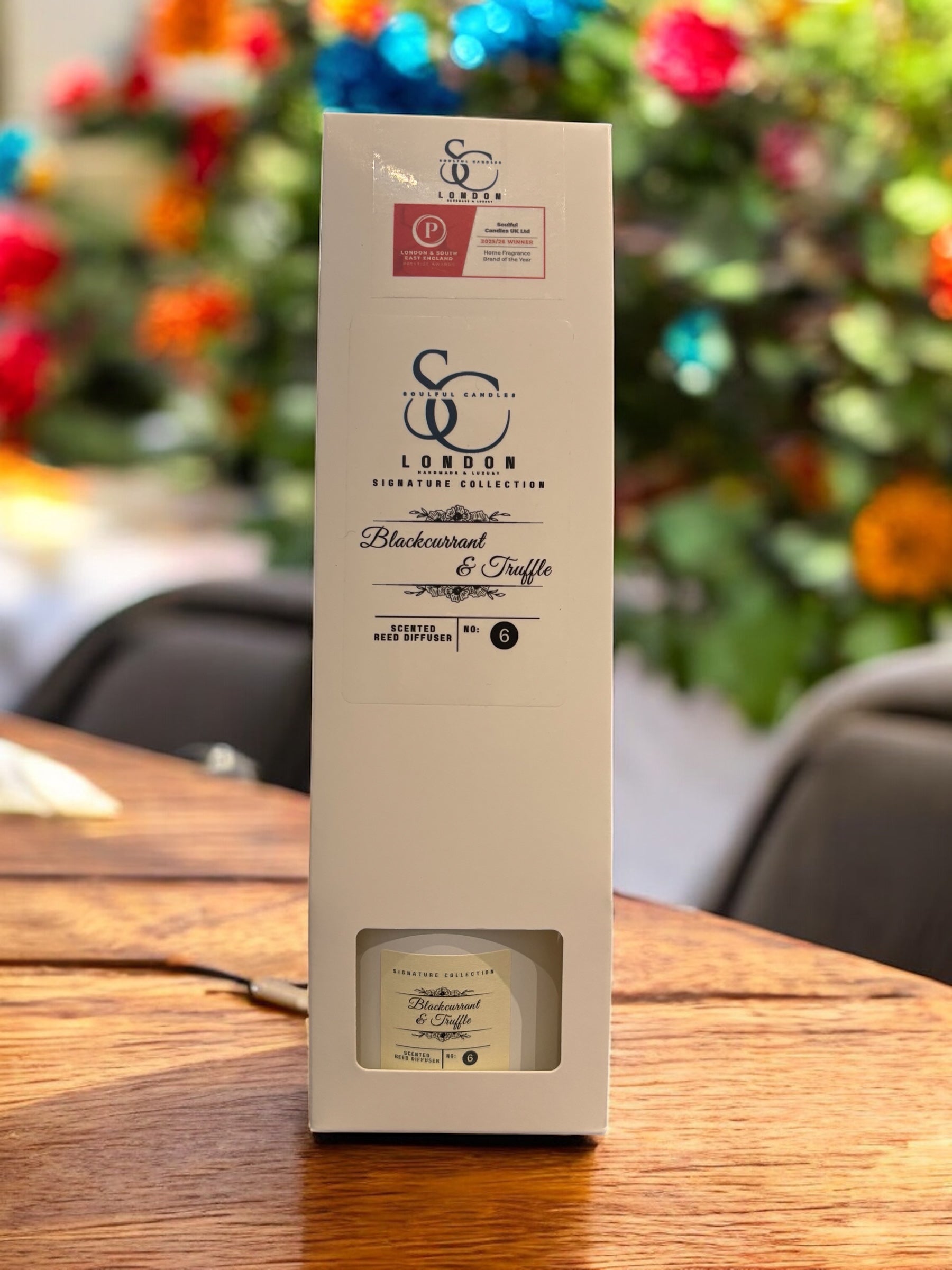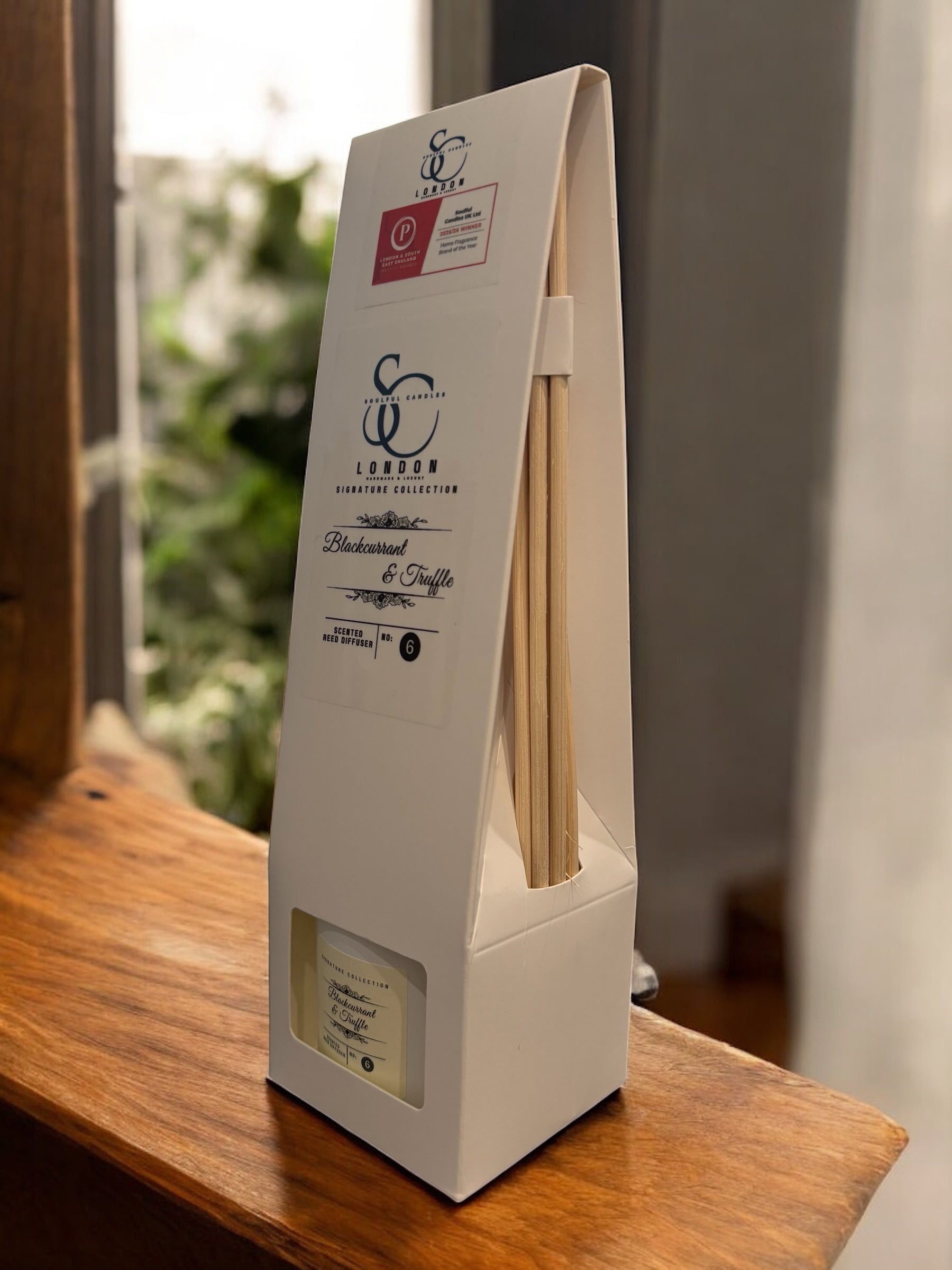 Elevate your home with the luxurious aroma of Blackcurrant & Truffle. This 100ml reed diffuser combines the rich, fruity notes of blackcurrant with the decadent essence of truffle, creating a sophisticated and captivating fragrance. Encased in a sleek white glass bottle with a chrome cap and five natural reeds, it effortlessly complements any décor. Enjoy a minimum of 2 months of long-lasting fragrance that transforms your space into a tranquil retreat. Perfect for living rooms, bedrooms, or gifting to someone special.