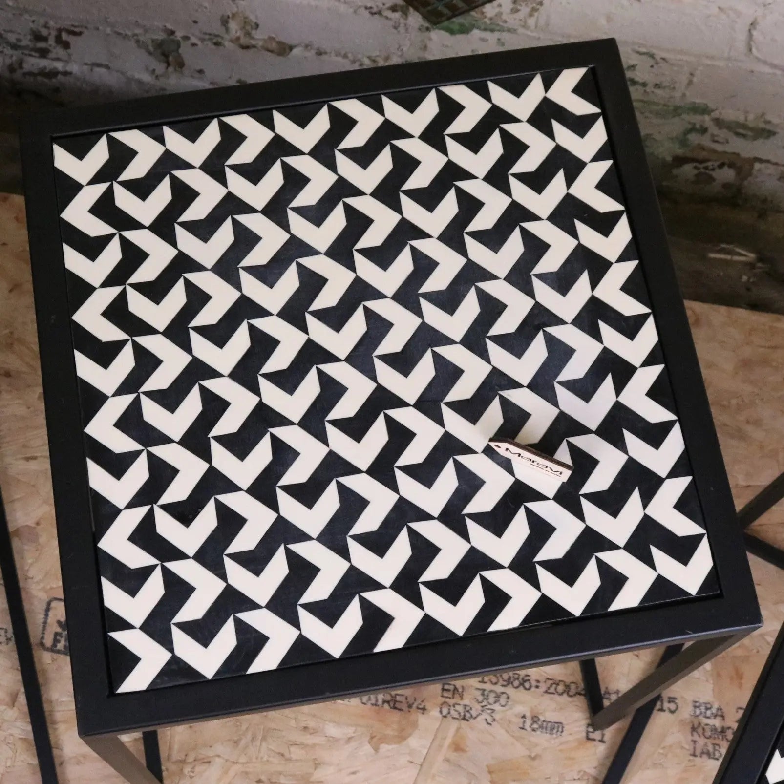 Elevate your living space with the Chinta Modern Black Square Nesting Side Tables. This chic set features a sleek black metal frame and eye-catching resin tabletops, each boasting a unique black and white geometric design. Perfect for adding a contemporary touch to any room, these tables are both stylish and functional.