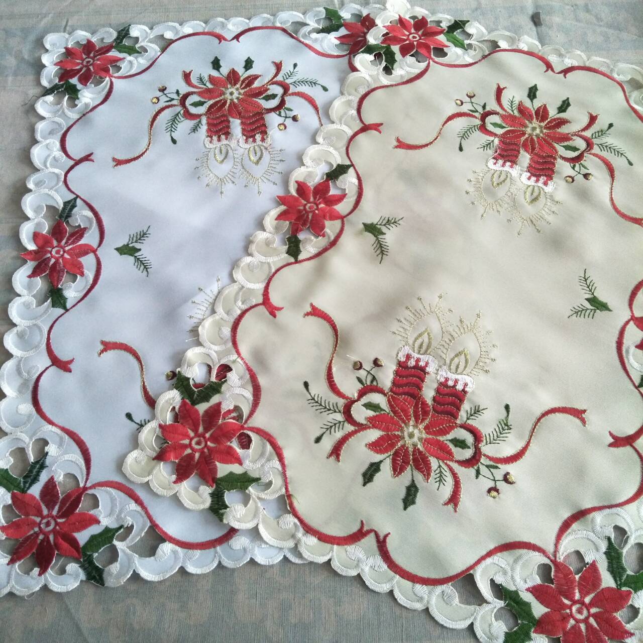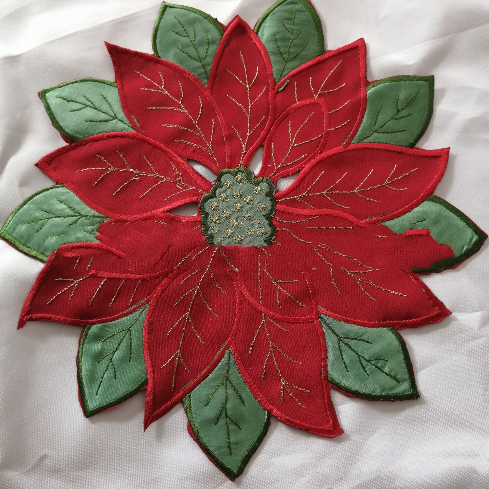 Color: bleached, light beige, red flowers and green leaves, red Christmas flowers, red and filled