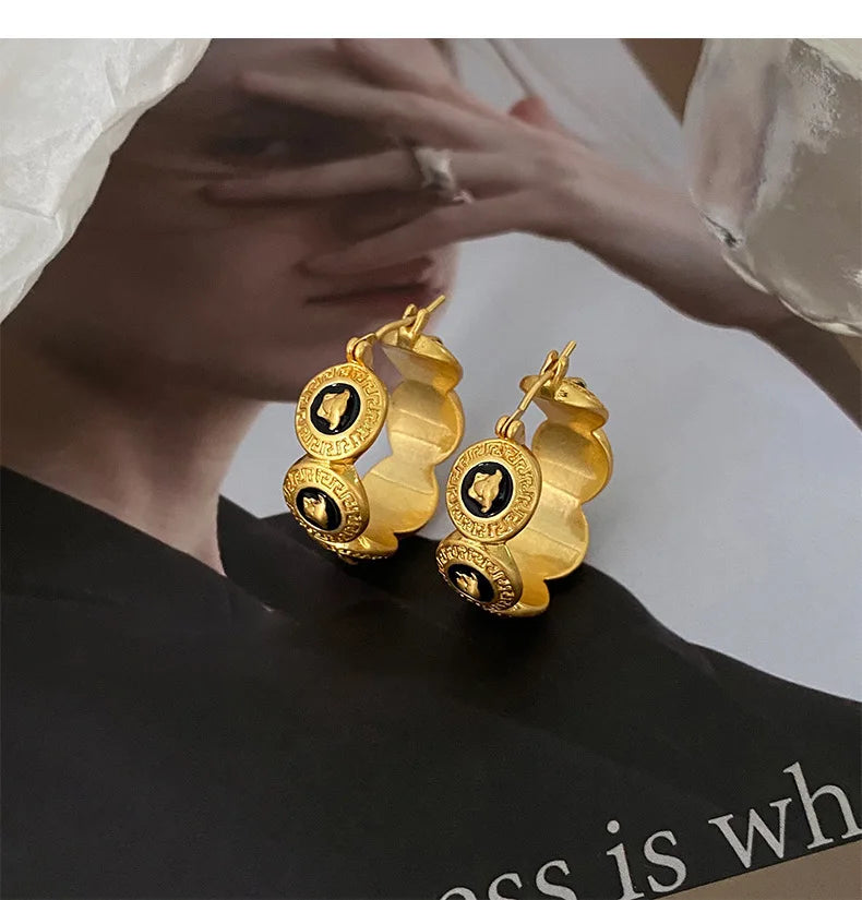 Classical Metal Retro Portrait Earrings Luxurious Fashion French Portrait Striped Circle Earstud Italian Handmade Palace Jewelry