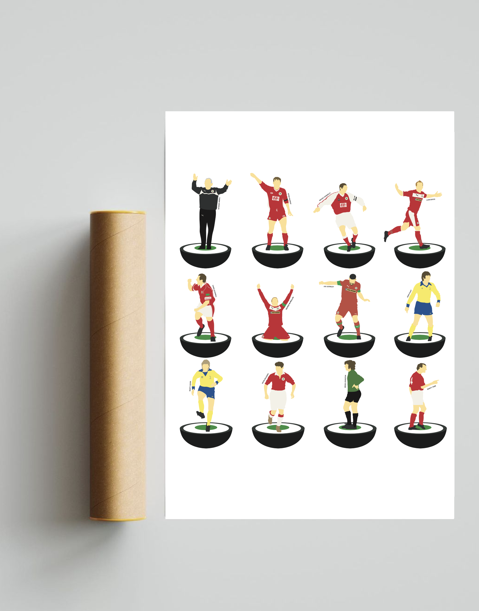 A3 print on 300gsm paper, Legends of Cliftonville Football club presented in a Subbuteo style design.