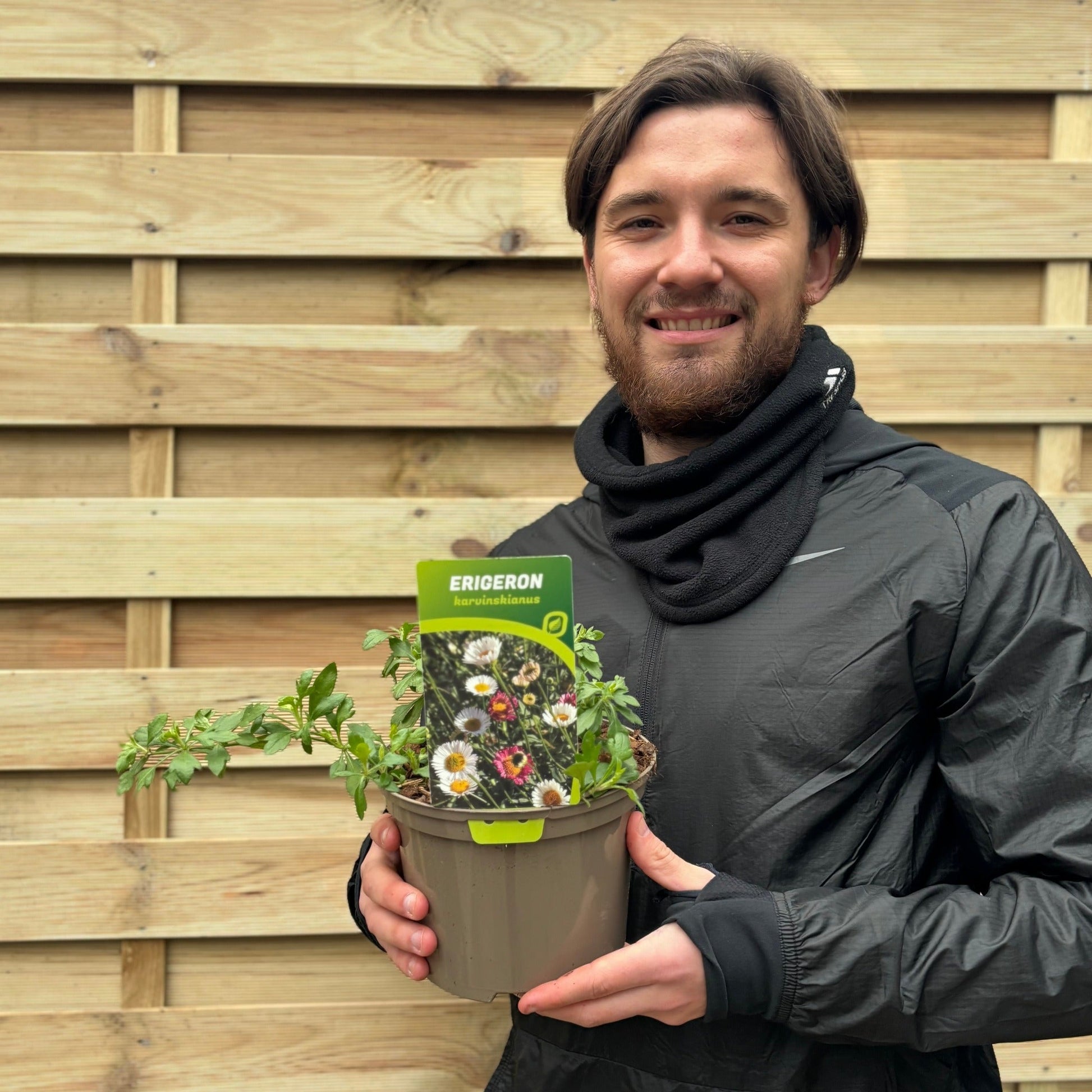 Erigeron karvinskianus, commonly known as Mexican Fleabane or Santa Barbara Daisy, is a delightful and adaptable perennial that effortlessly adds a touch of romance and whimsy to garden landscapes. Renowned for its masses of small daisies, this plant presents a captivating two-tone effect as the flowers emerge in pristine white, gradually transforming into shades of pink with cheerful yellow centres. The plant boasts an extended flowering period, gracing the garden with its charming blooms from May to October. The unique colour transition of the flowers, coupled with the abundance of delicate daisies, creates an enchanting spectacle that continuously evolves throughout the growing season.