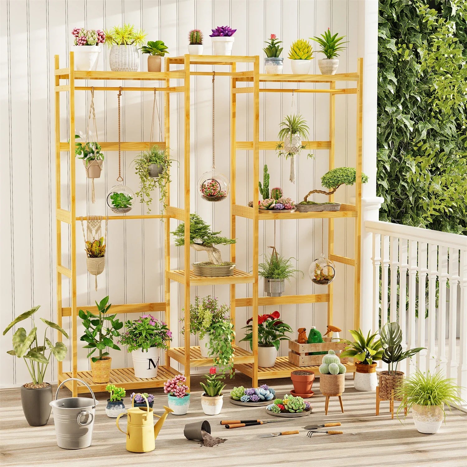 Extra Large Bamboo Clothes Stand Multytier Storage Shelves Clothes Hanging Rack with Hanging Rails for Cloakroom, Bedroom