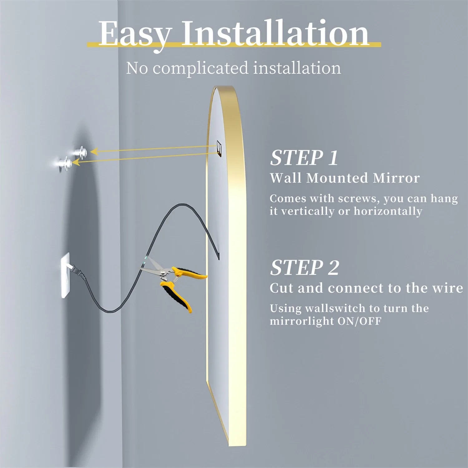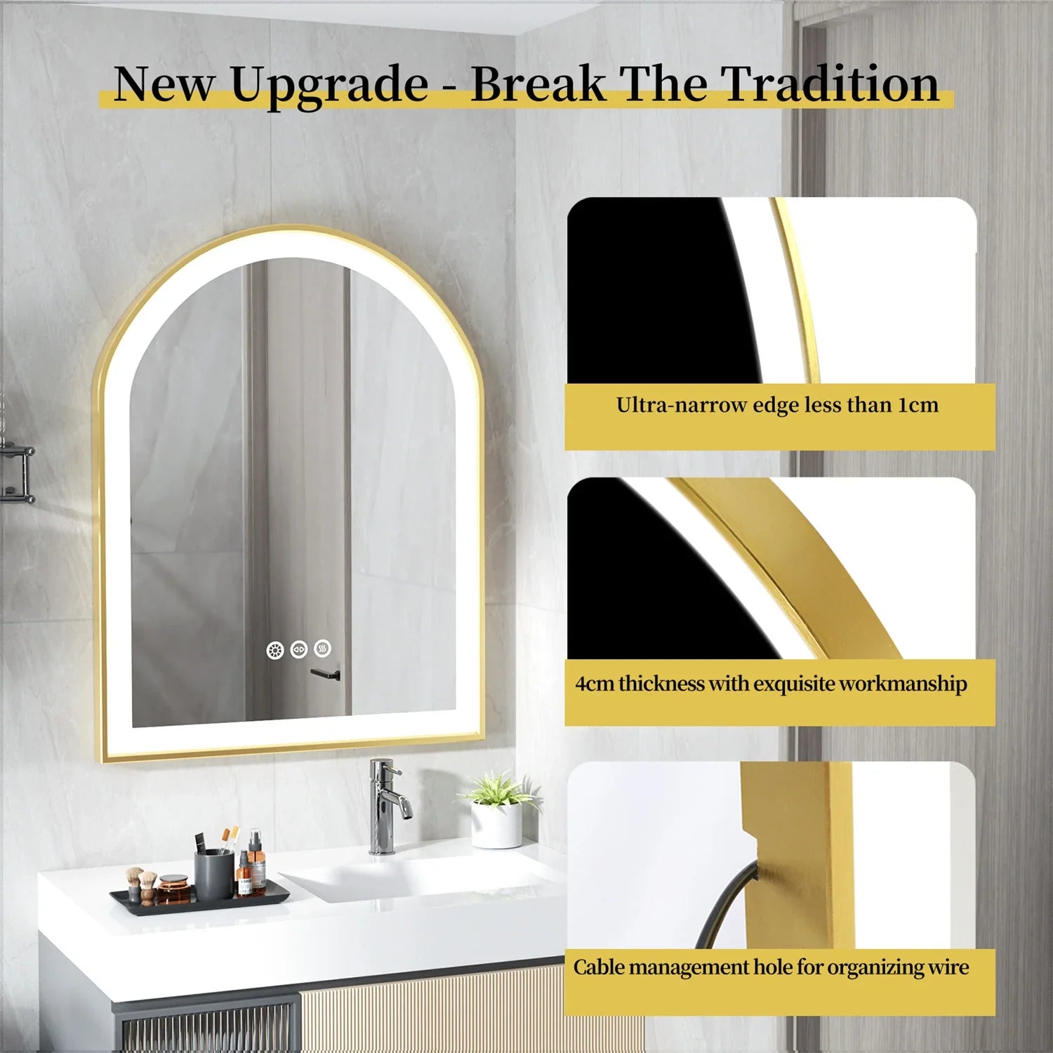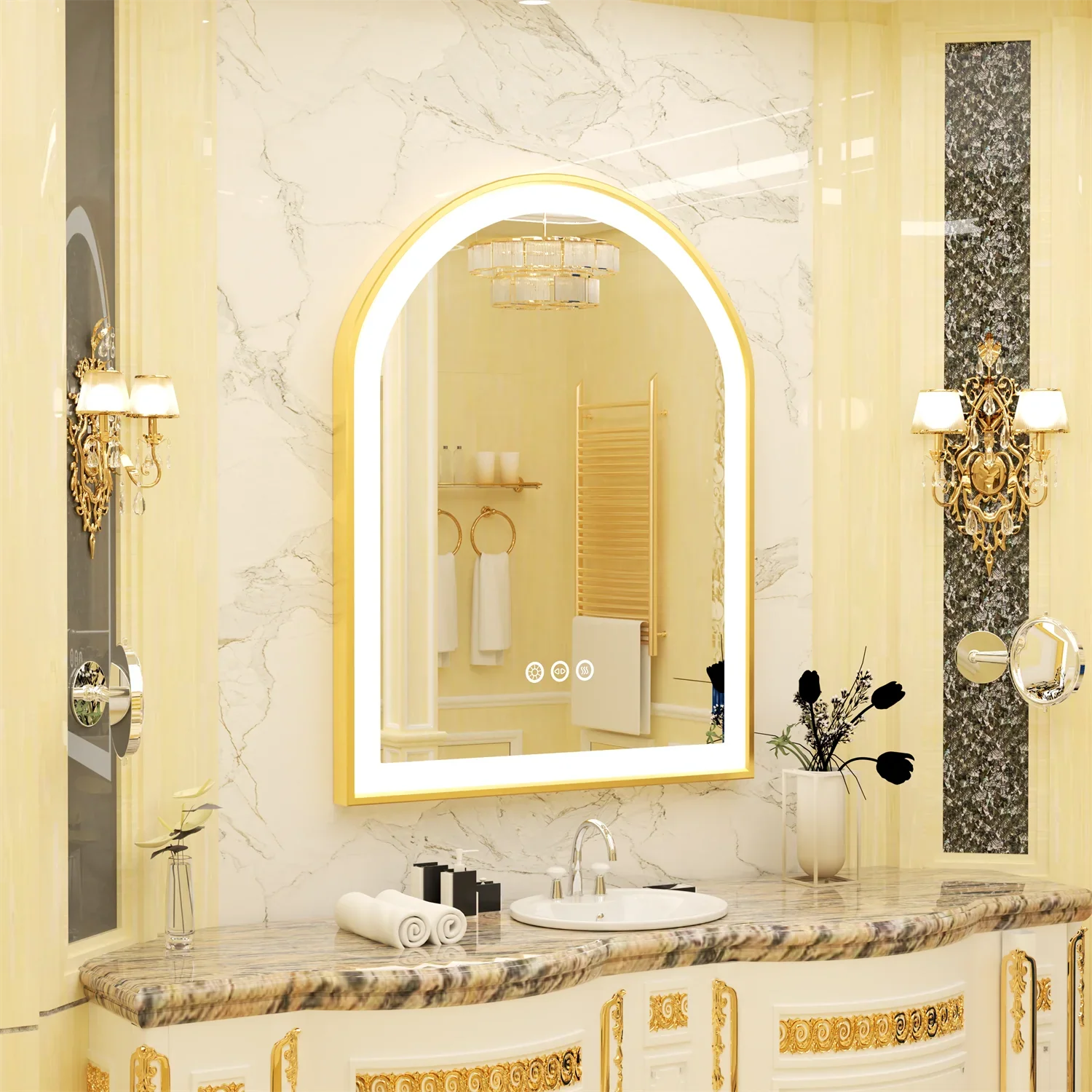 Gold Bathroom Mirror with Lights 36" LED Backlit Arch Wall Mirror Brushed Frame Touch Antifog 3 Colors Lights Adjust