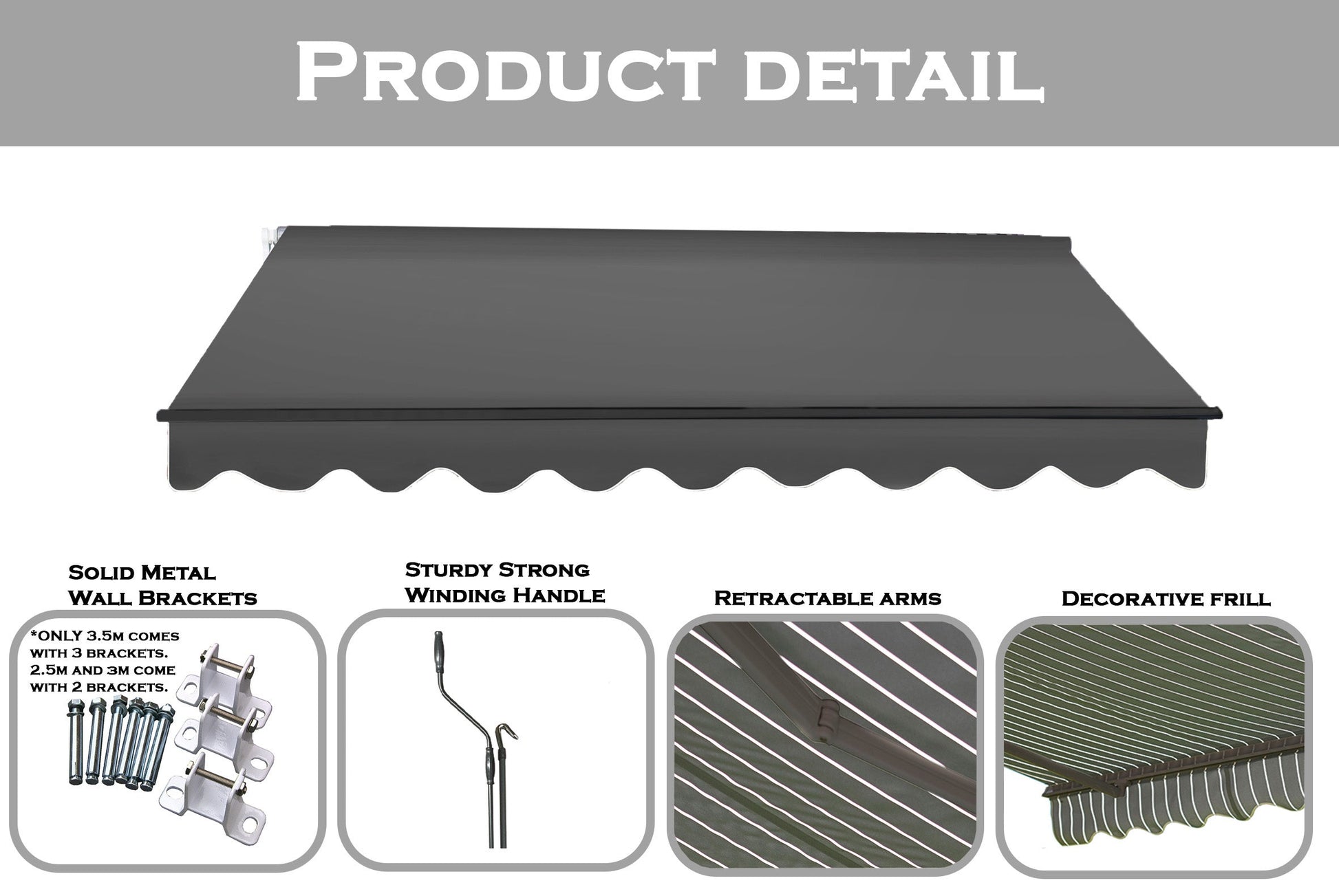 Available in 2.5m, 3m, and 3.5m widths, the Grosvenor awning provides generous shade coverage—extending up to 2m for the smaller sizes and 2.5m for the larger 3.5m model. Operation is simple with a detachable winding handle for smooth opening and closing, while the unit can be easily removed from its brackets for secure storage during winter months.