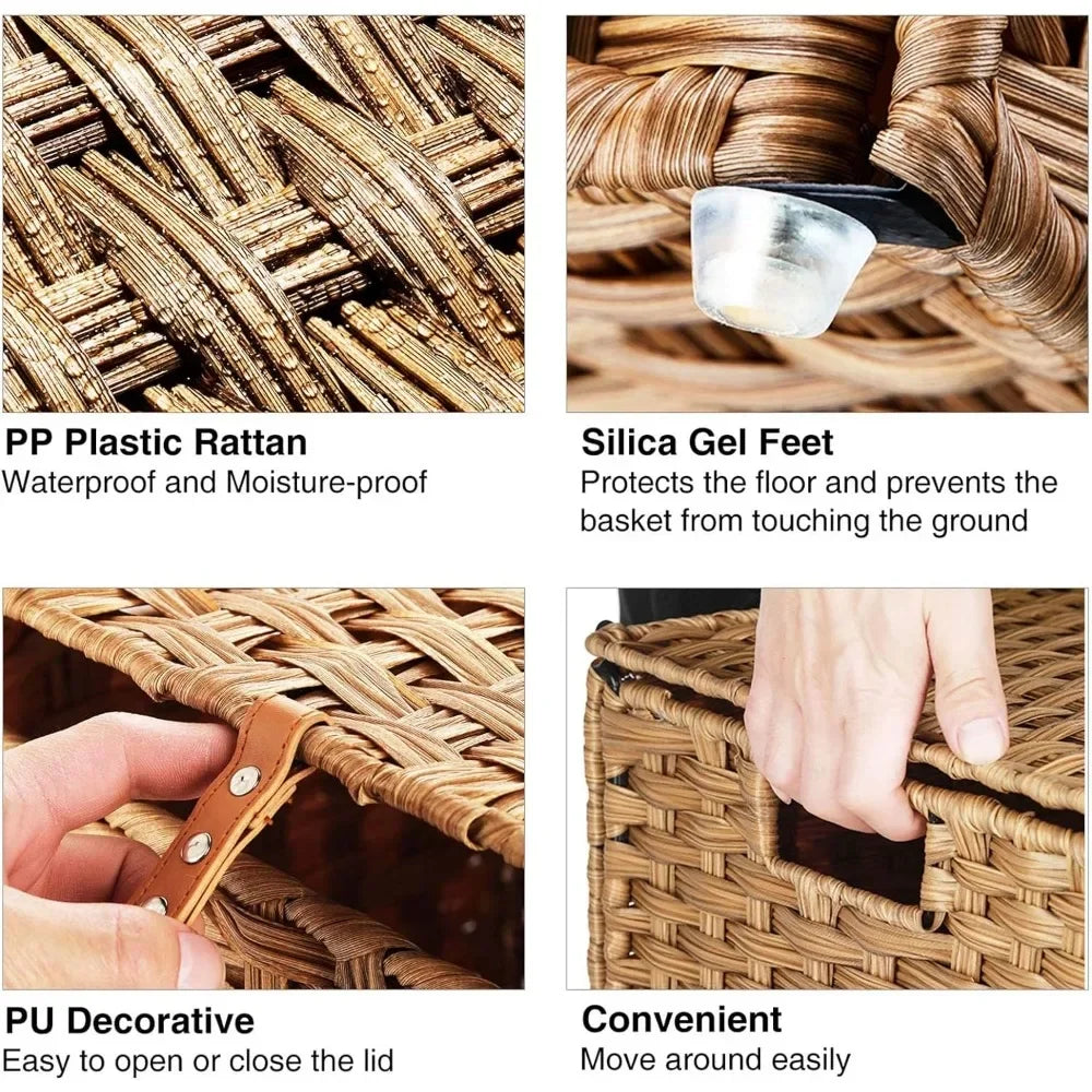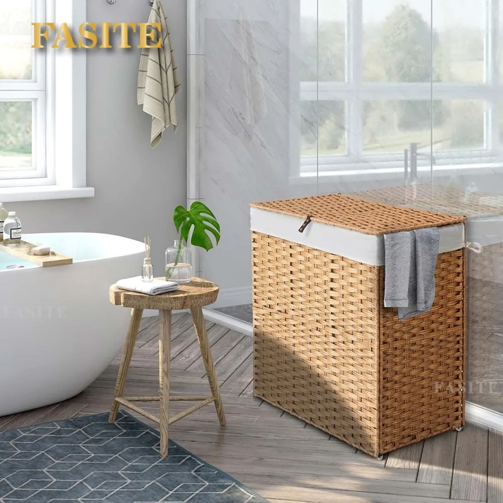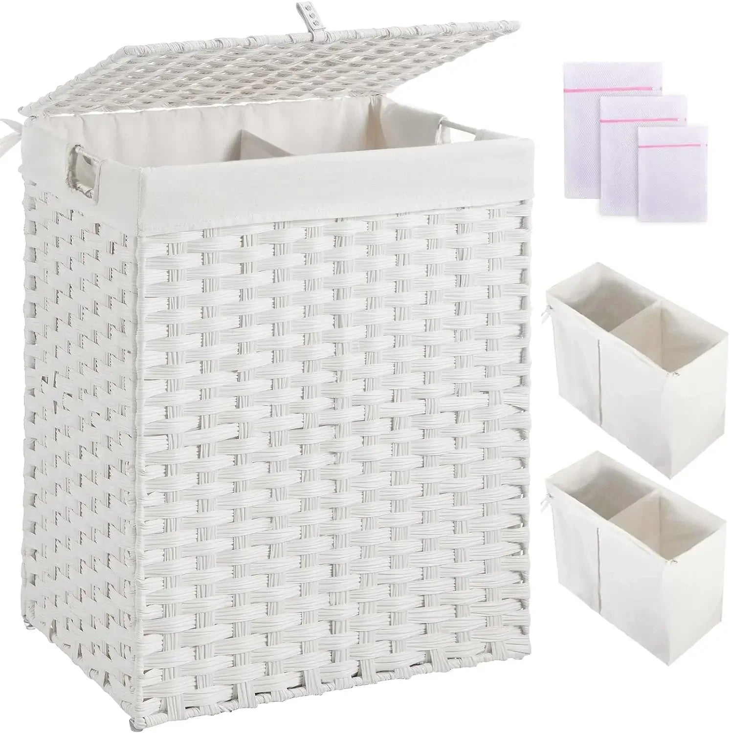 Greenstell Laundry Hamper with lid, No Install Needed, 110L Wicker Laundry Baskets Foldable 2 Removable Liner Bags, 2 Section