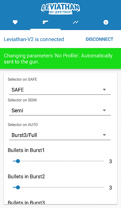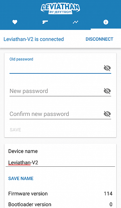 - Programmed settings are saved in the Leviathan - V2 memory immediately after their change, so settings aren't lost when is Bluetooth or battery disconnected
