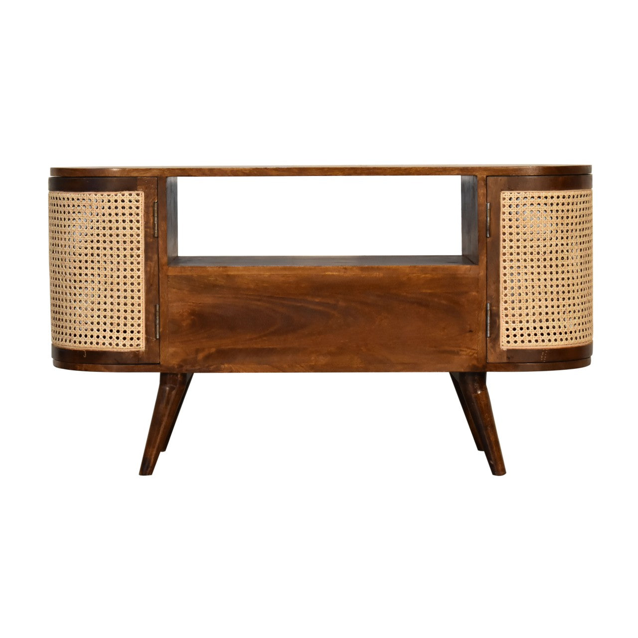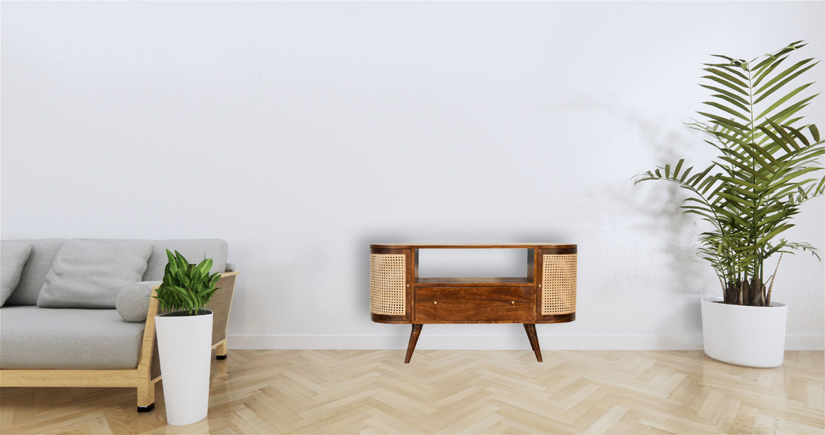 - Ample Storage: Includes two woven cabinets for storing media devices and accessories.
