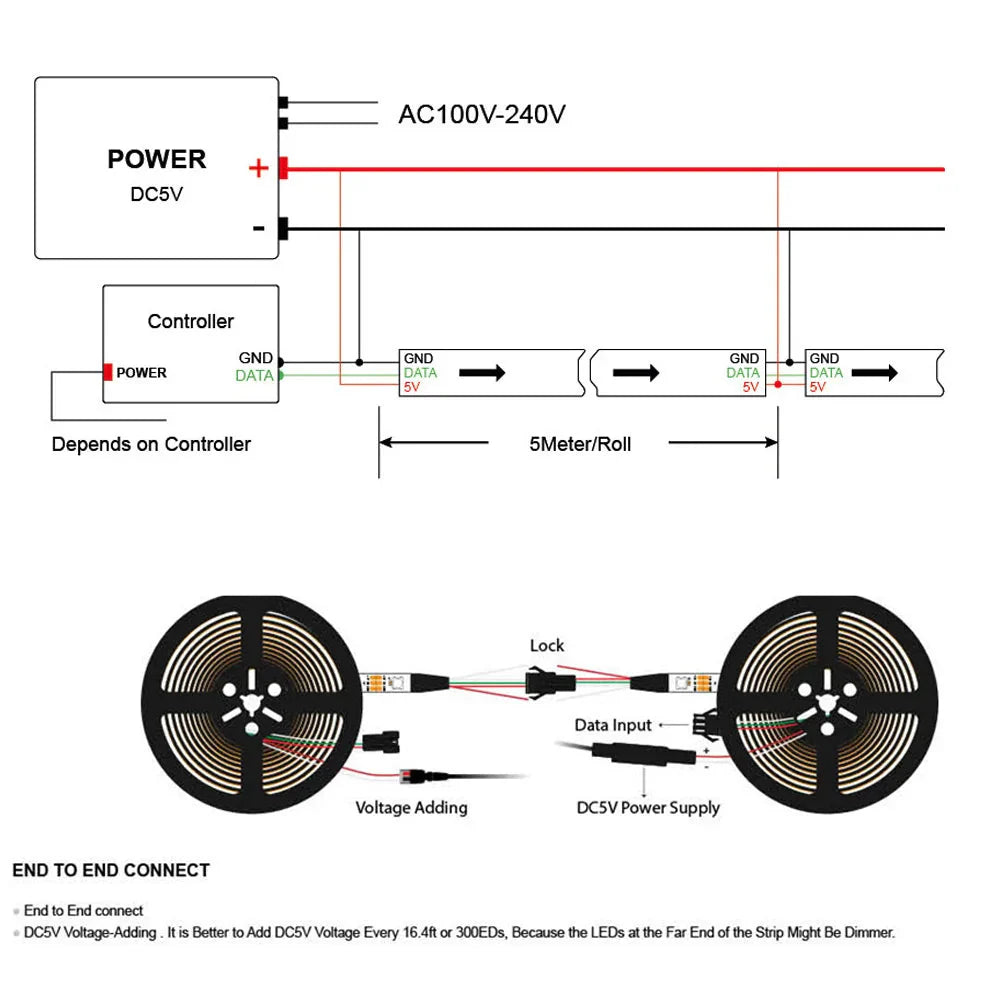 7. Longer LED Strip Runs, Please Add More Power to 2 Pin Power Wire of Both Ends To Reduce Voltage Drop.