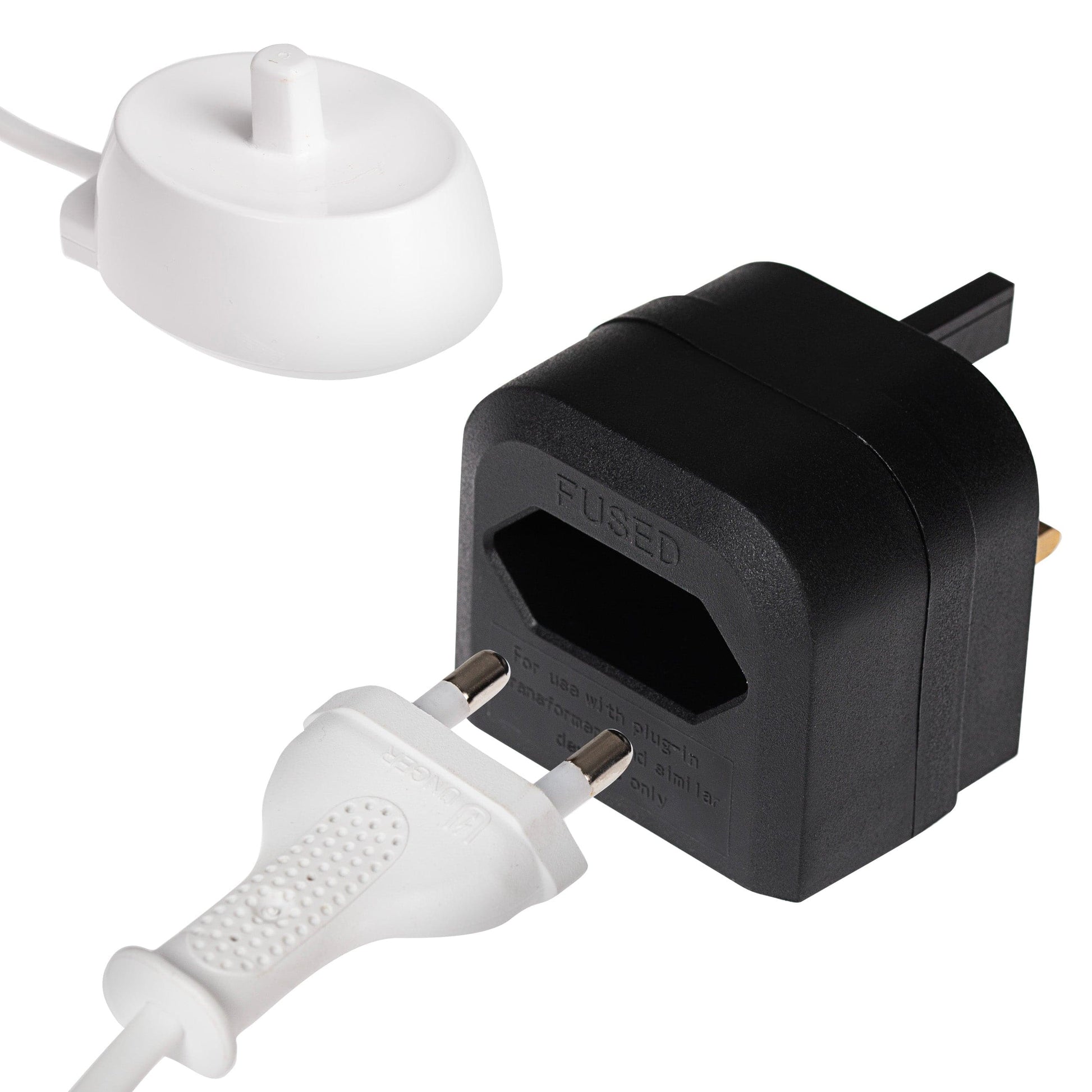 This plug converter is ideal where the 2 pin plug prongs are slightly shorter and thicker as seen on a toothbrush / shaver charger cable.
