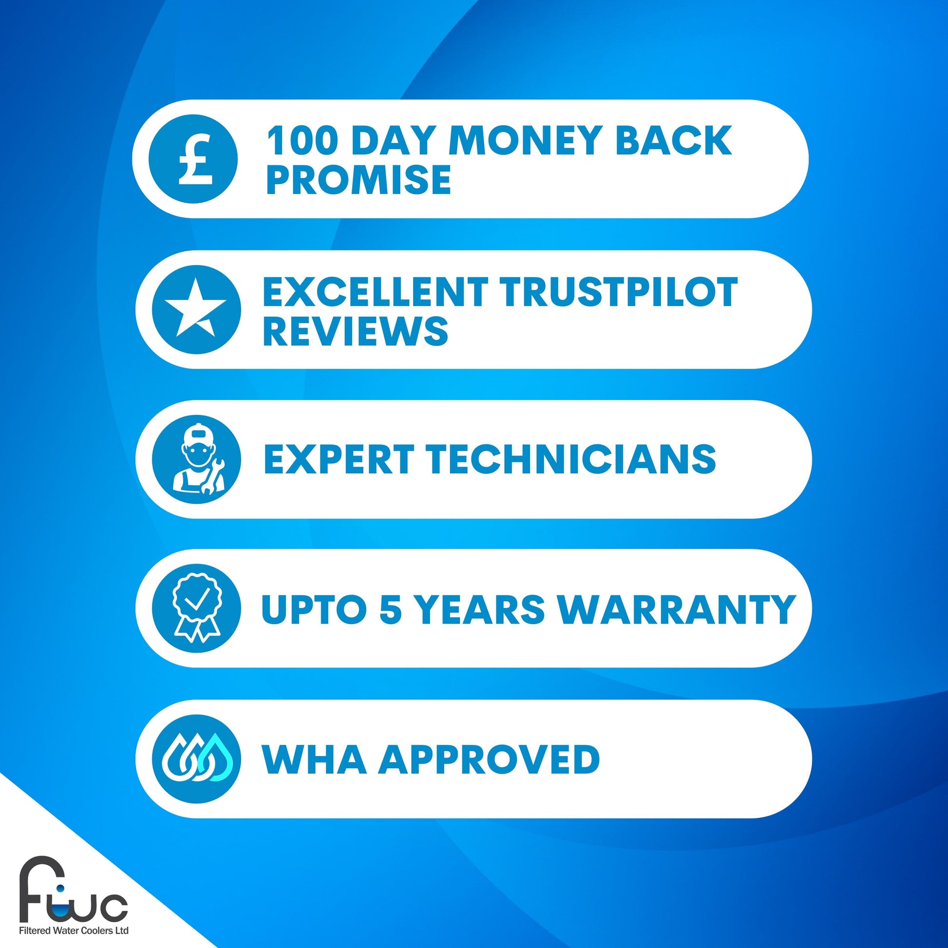 As one of the UK’s leading hydration specialists. FWC have built a reputation for quality products backed by an impressive 100-day money back guarantee. Our guarantee means you can buy with confidence, knowing that our products will give you many years of assured use, giving you peace of mind and a sense of security.