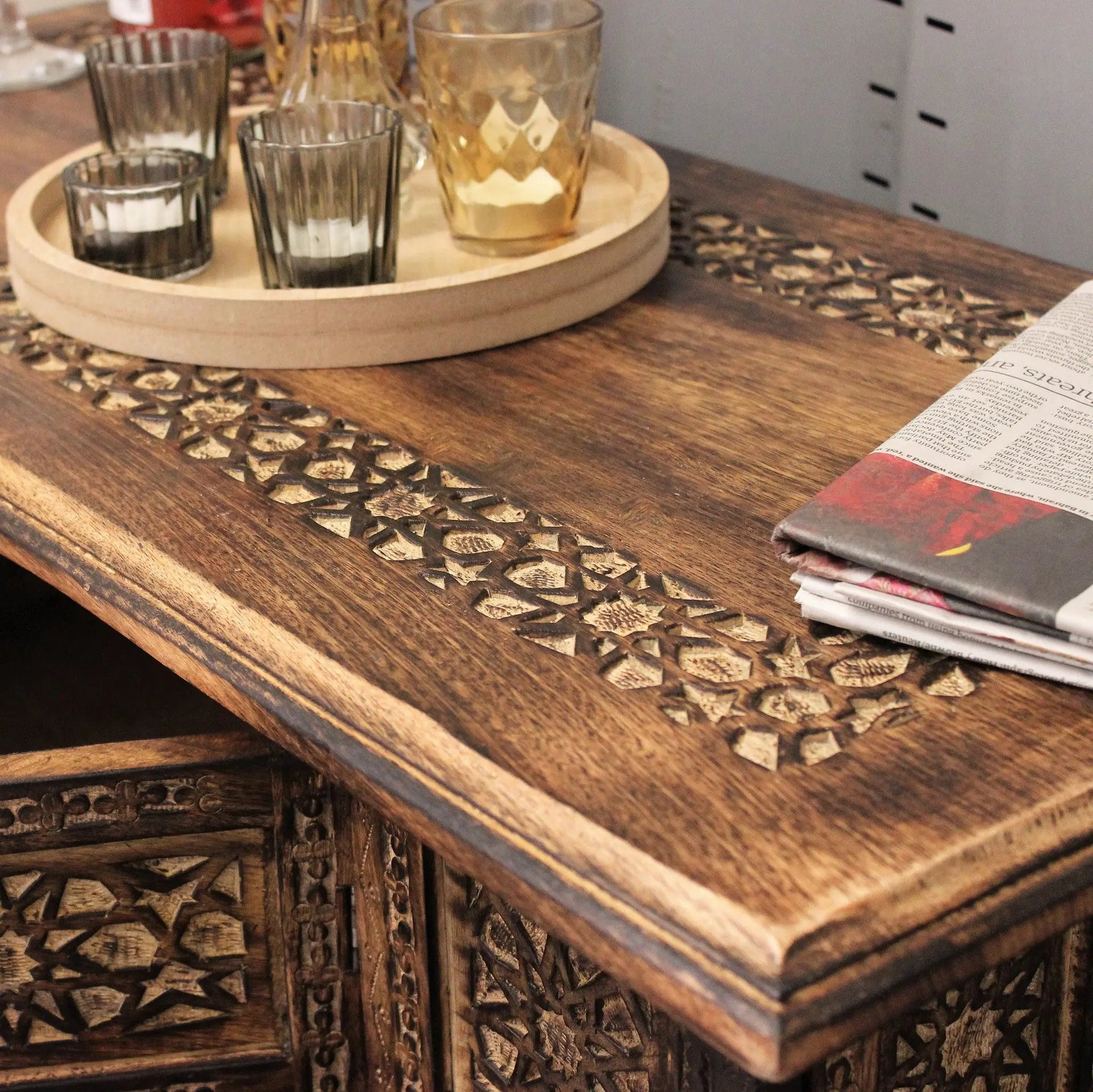 The Mehanadi Moroccan Coffee Table is designed to complement any room in your home. Its intricate hand-carved details and hidden storage make it a versatile and practical addition to your living room or conservatory.