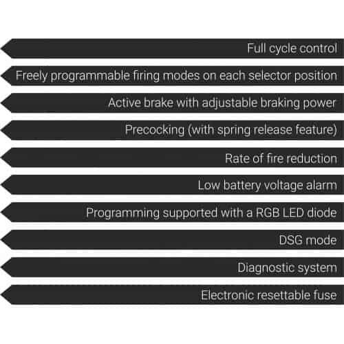 - Active brake - active brake stops the motor after each shot preventing spring compression or in case of replicas with a high rate of fire, overspin (double shot problem).