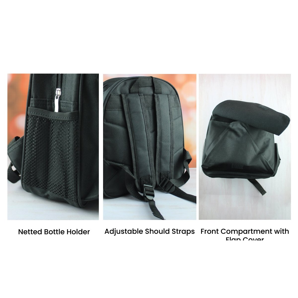 Printed Kids Black Backpack with Comic Book Superhero Design, Customise with Any Name