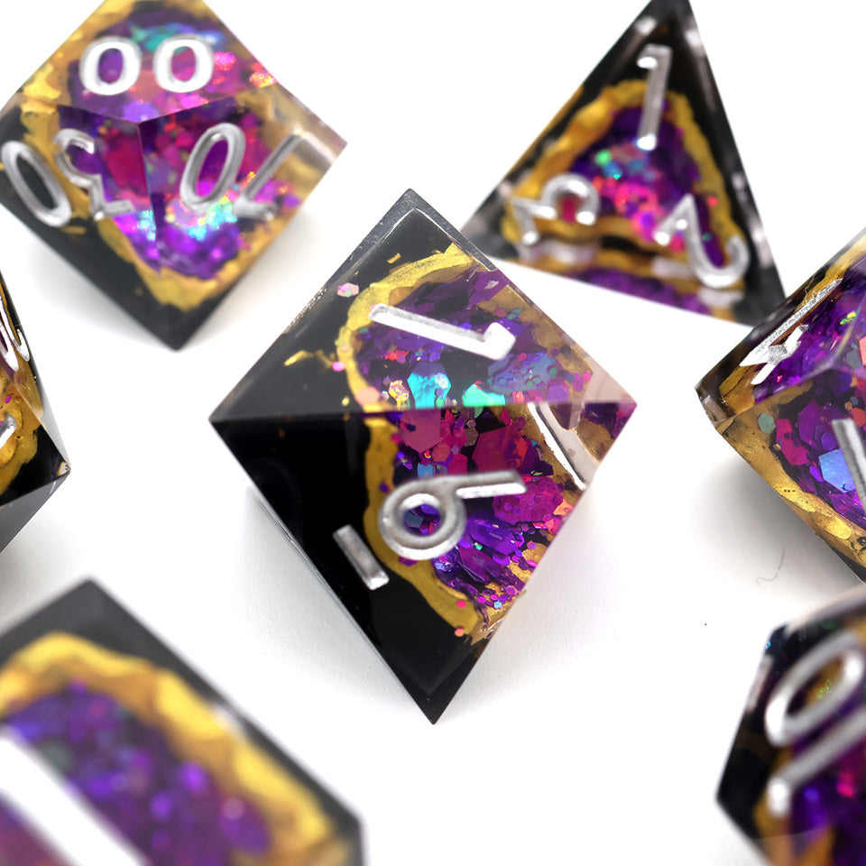 Embark on your Dungeons and Dragons adventures with the Regal Relic Crystalline Geode Dice set, designed to invoke the mystique and majesty of ancient treasures. Each die in this exquisite set features a polished surface that reveals an amethyst-coloured geode, resplendent against a stark black background and luxuriously edged in gold. This opulent combination not only enhances the visual appeal of your gameplay but also resonates deeply with the epic themes and characters encountered in DnD.