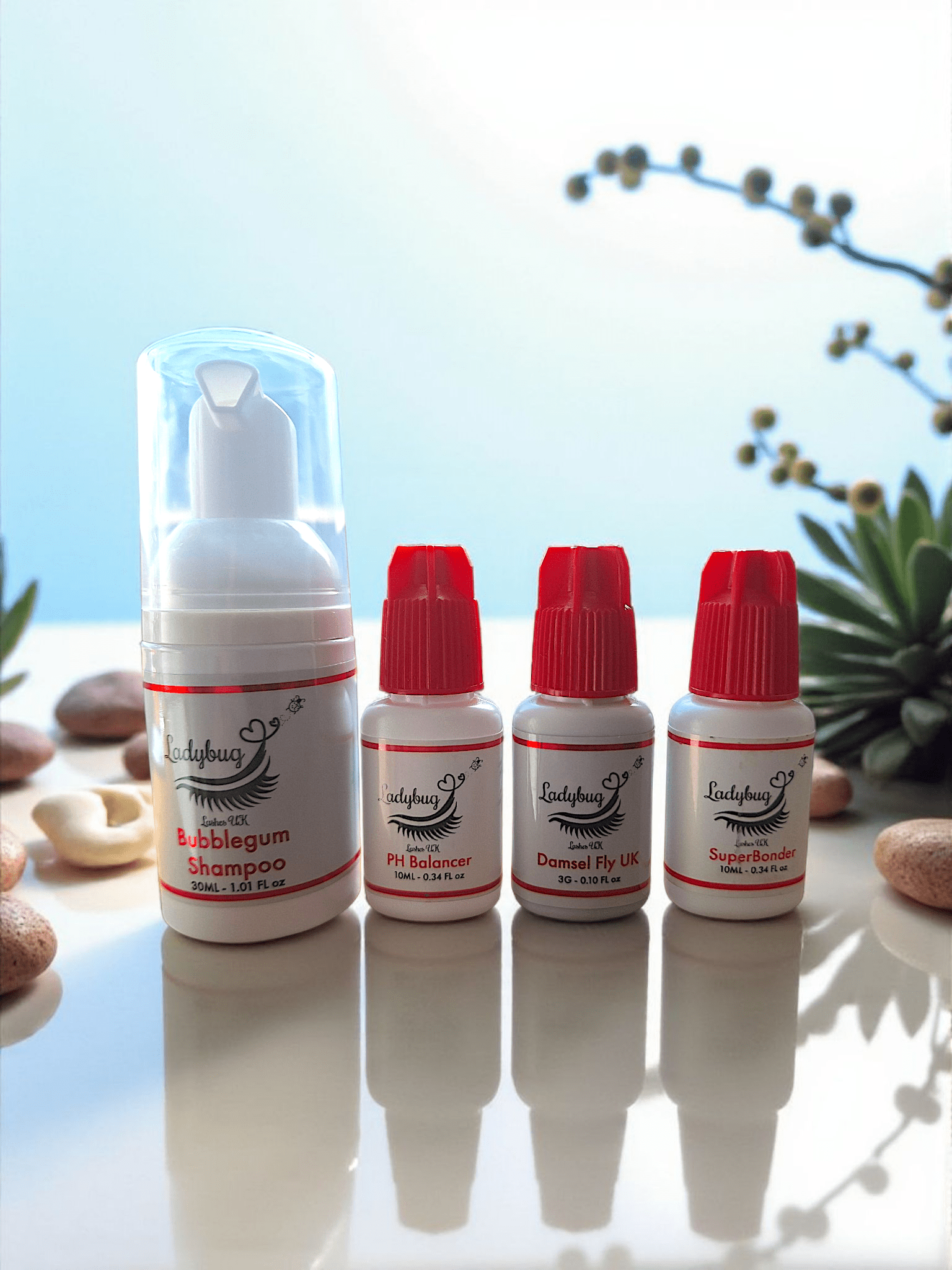 Imagine the perfect storm of lash longevity, beauty, and client satisfaction coming together seamlessly. Meet your dream team: Lash Shampoo Bubble Gum Scent, PH Balancer, Superbonder, and our trusted UK-Manufactured Adhesive — your secret weapons in the lash extension battlefield.
