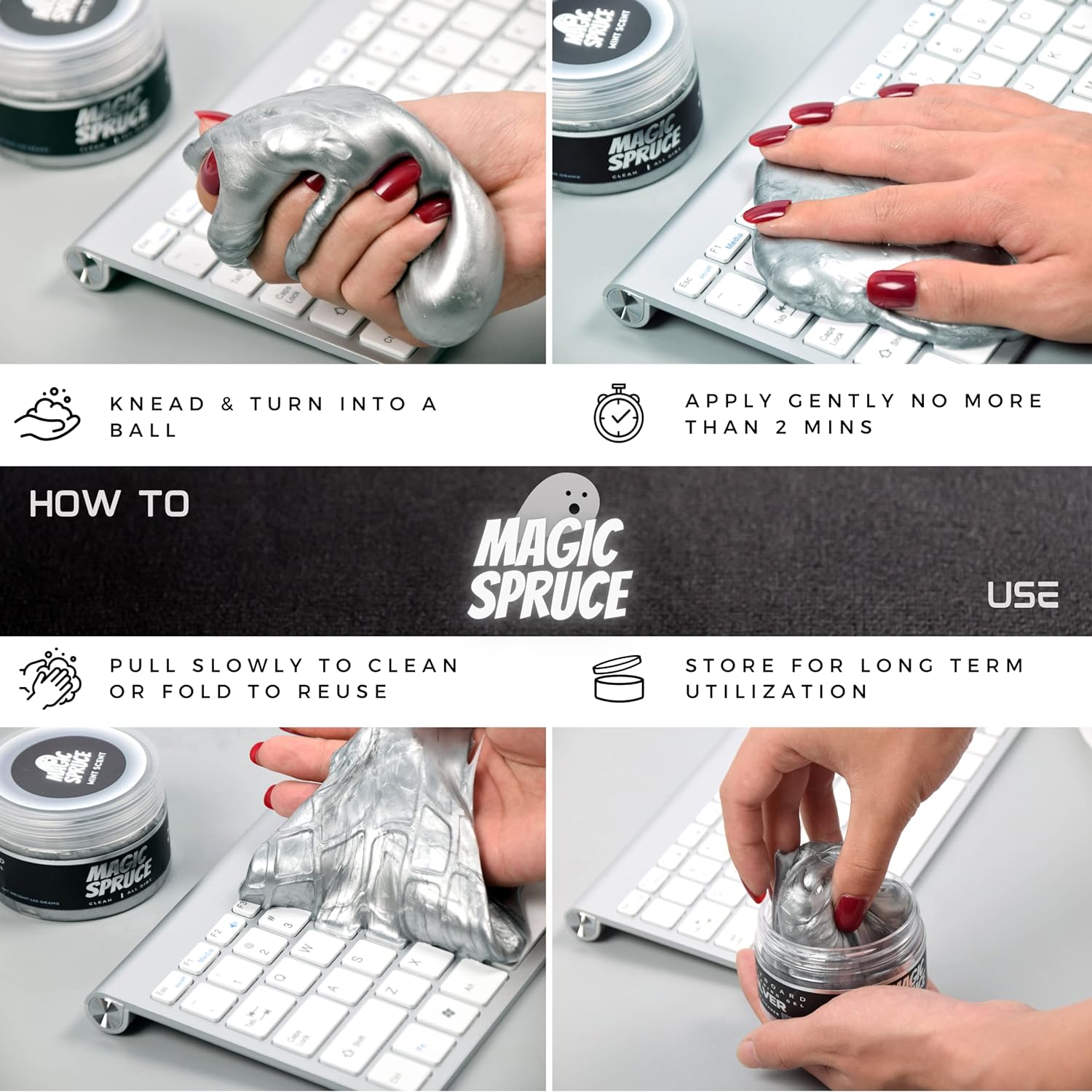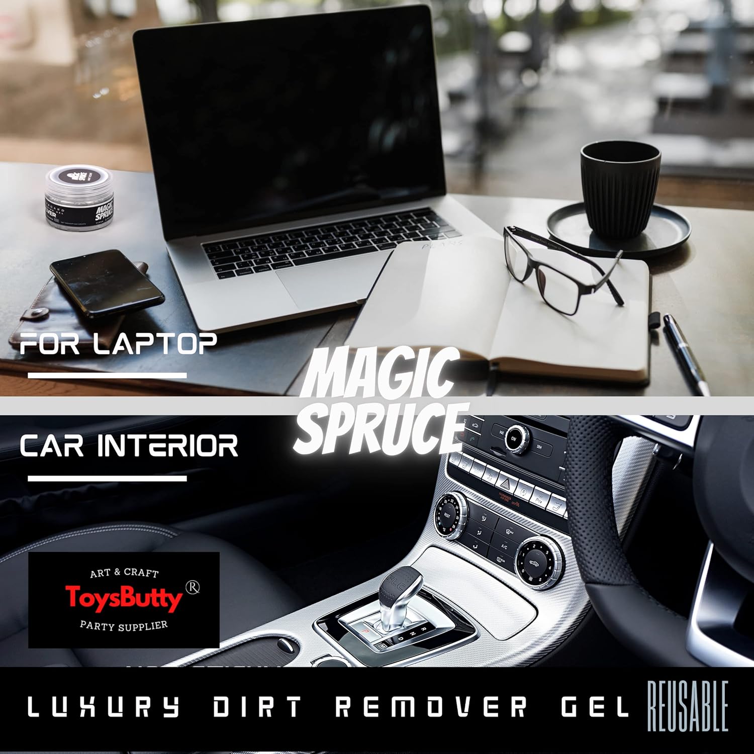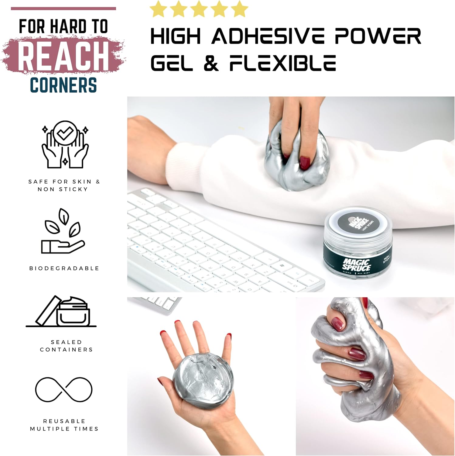 - LUXURY SILVER CAR CLEANING GEL: Enjoy the stylish Magic Spruce Car cleaning gel that comes in a luxurious silver colour suitable for luxurious devices or cars, take care of car interior cleaning by making often used areas look always as if new, give your favourites the shine they deserve. No need for water-based car cleaning products or time-consuming clean ups, this non-sticky cleaning gel slime can remove dirt easily on your car dashboard, catching dirt everywhere rapidly.