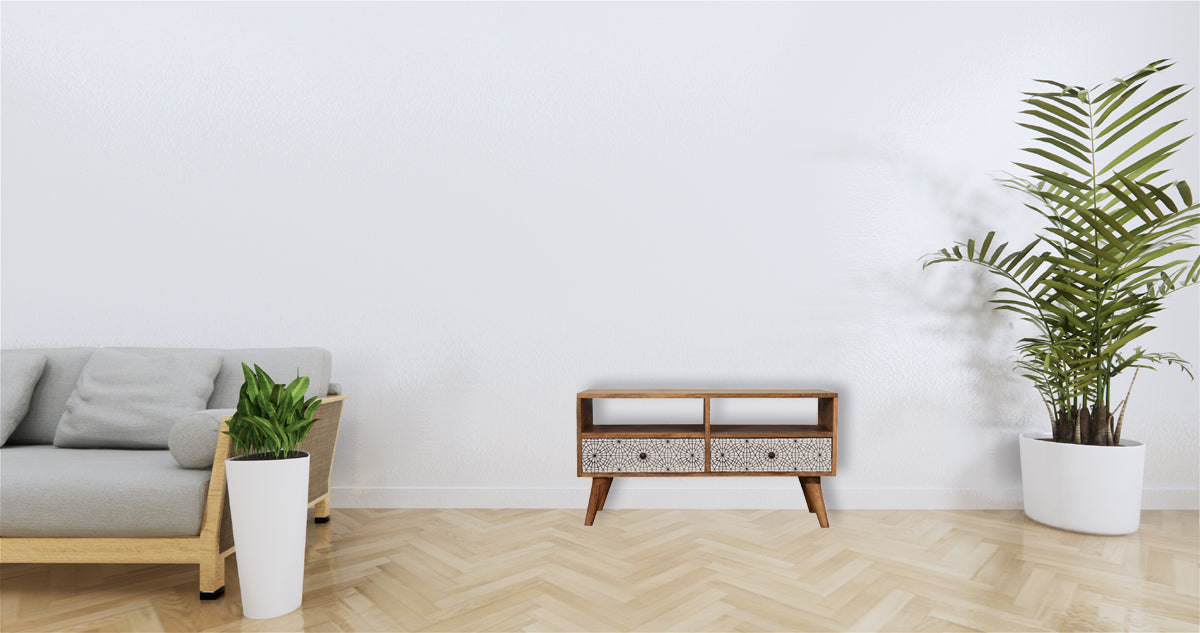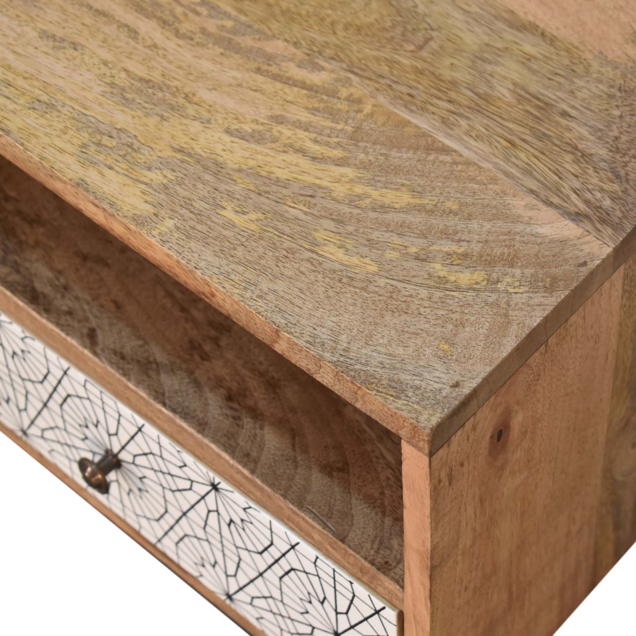 - Design: Features screen-printed drawer fronts with a captivating black and white geometric pattern.