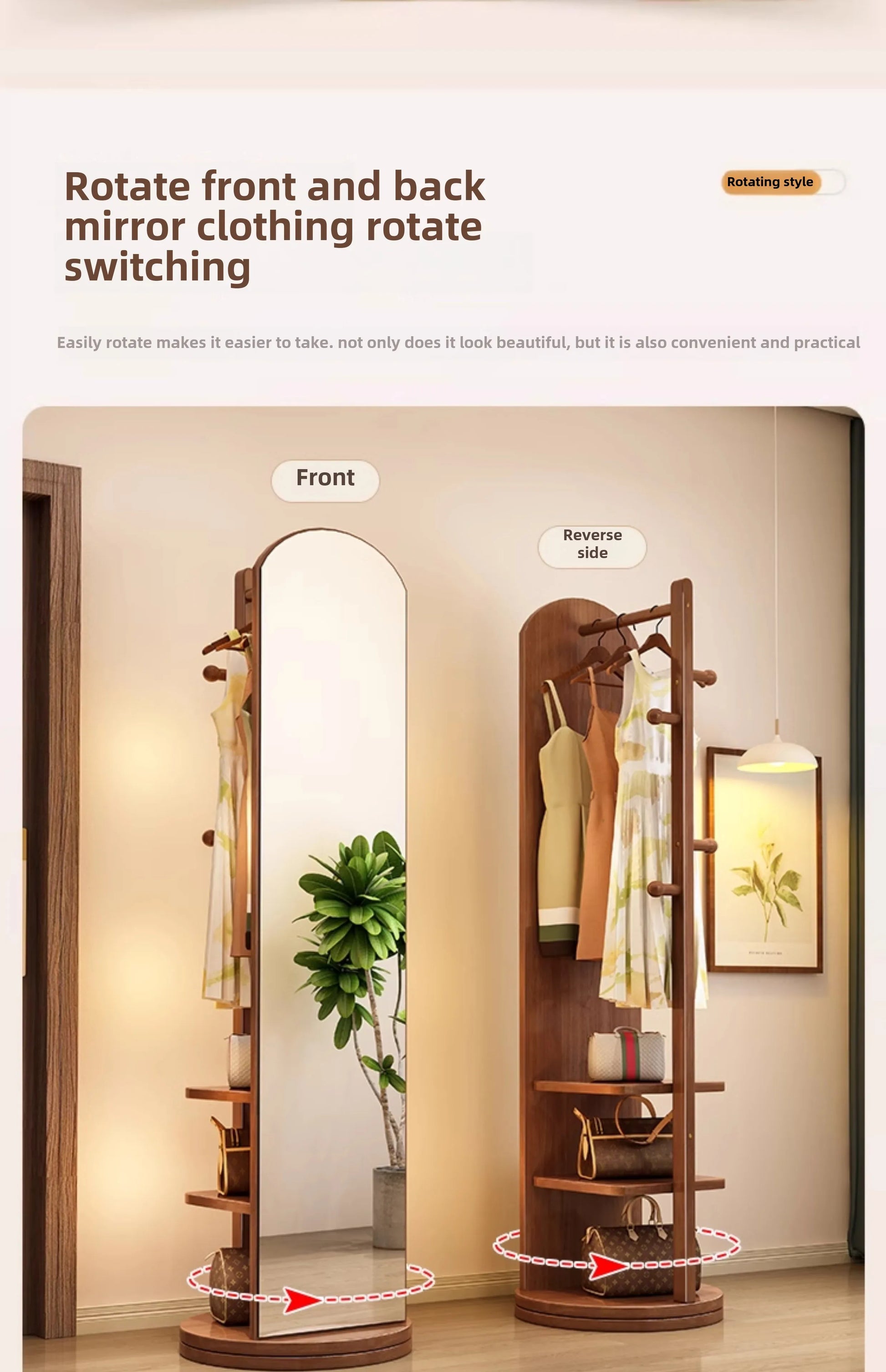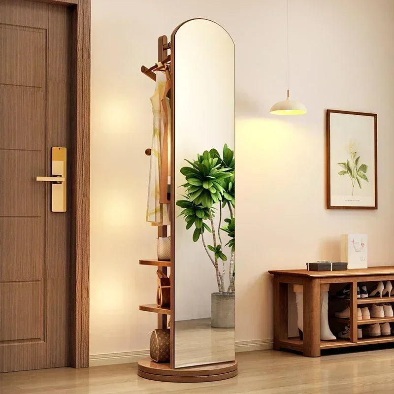 Solid wood hanger bedroom floor coat rack with mirror integrated