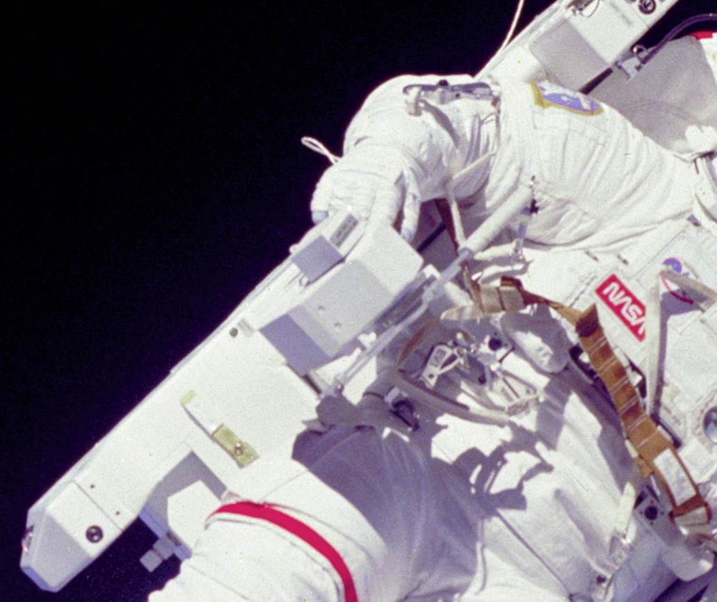Views of the extravehicular activity during STS 41-B on 11 February 1984. Astronaut Bruce McCandless II, mission specialist, participates in a extra-vehicular activity (EVA), a few meters away from the cabin of Space Shuttle Challenger. He is using a nitrogen-propelled hand-controlled Manned Maneuvering Unit (MMU). He is performing this EVA without being tethered to the shuttle. The picture shows a cloud view of the Earth in the background.
