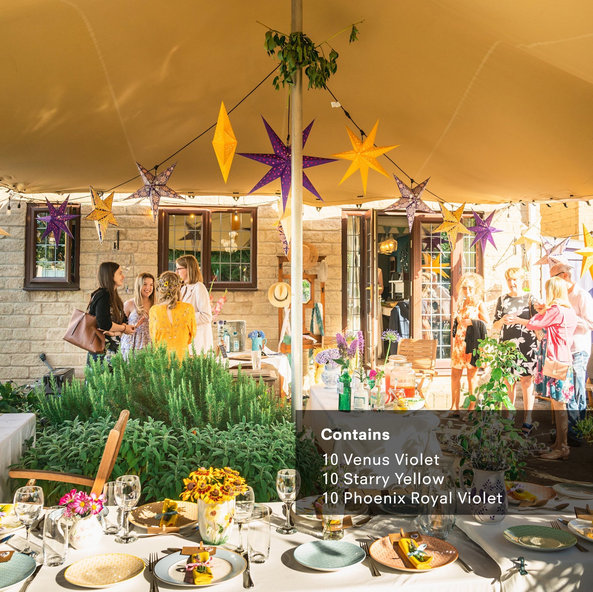 Looking for vibrant, eco-friendly wedding décor that brings your celebration to life? This stunning bundle of 30 handcrafted paper star lanterns in sunshine yellow and deep violet is made to elevate your summer wedding from outdoor ceremonies to magical evening receptions.