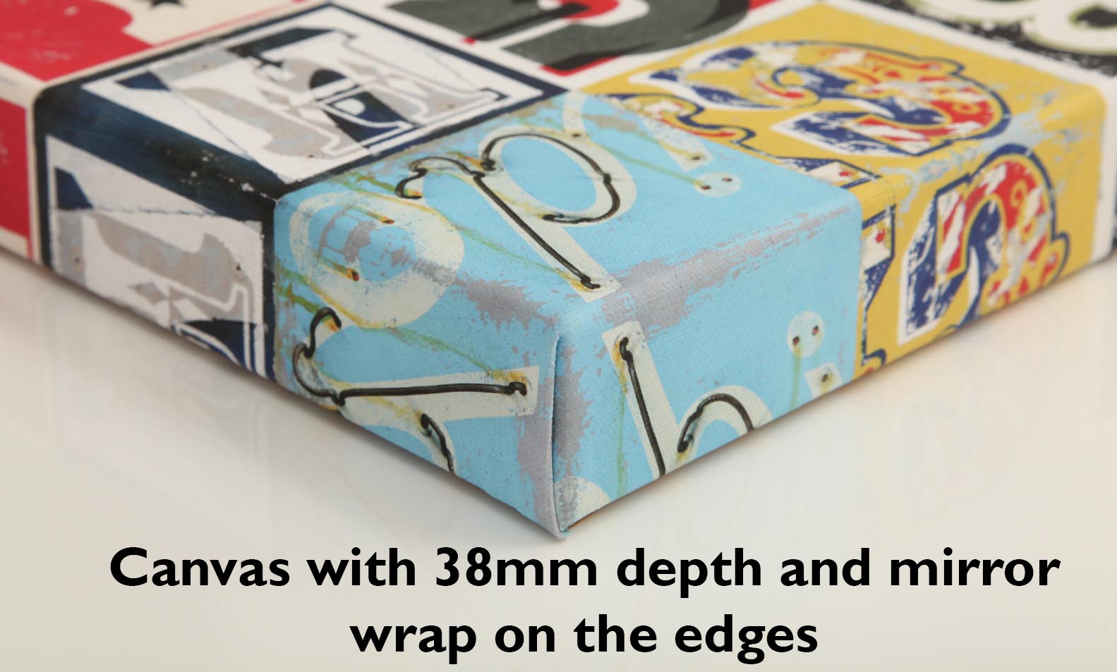 Canvas: Stretched canvas on a wooden frame with 38mm of depth. Finger jointed canvas frames create corner tension which helps to resist warping. A "Mirror wrap" on the edges of the image is repeated on the sides with the entire image appearing on the front.